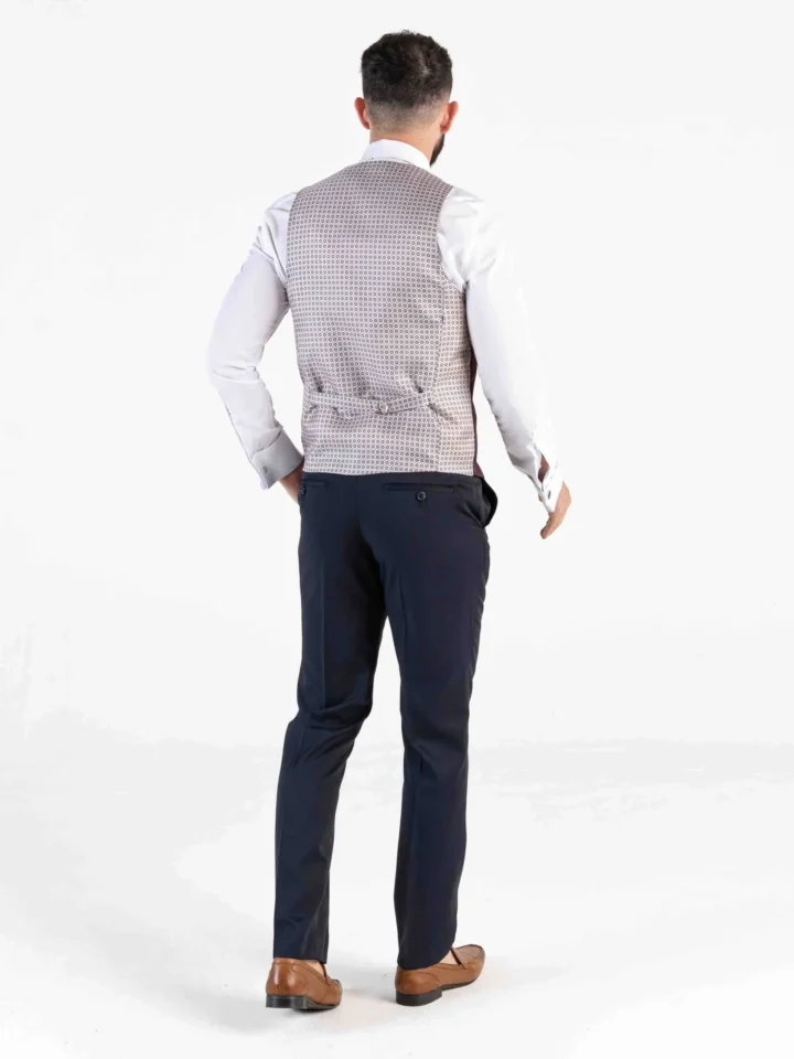 Underneath, the burgundy waistcoat adds richness and contrast. Crafted with adjustable straps at the back, it allows for a custom fit and ensures you stay sharp from ceremony to evening reception. The deep tone of the waistcoat balances the lighter blazer, creating a layered look that’s bold yet harmonious.