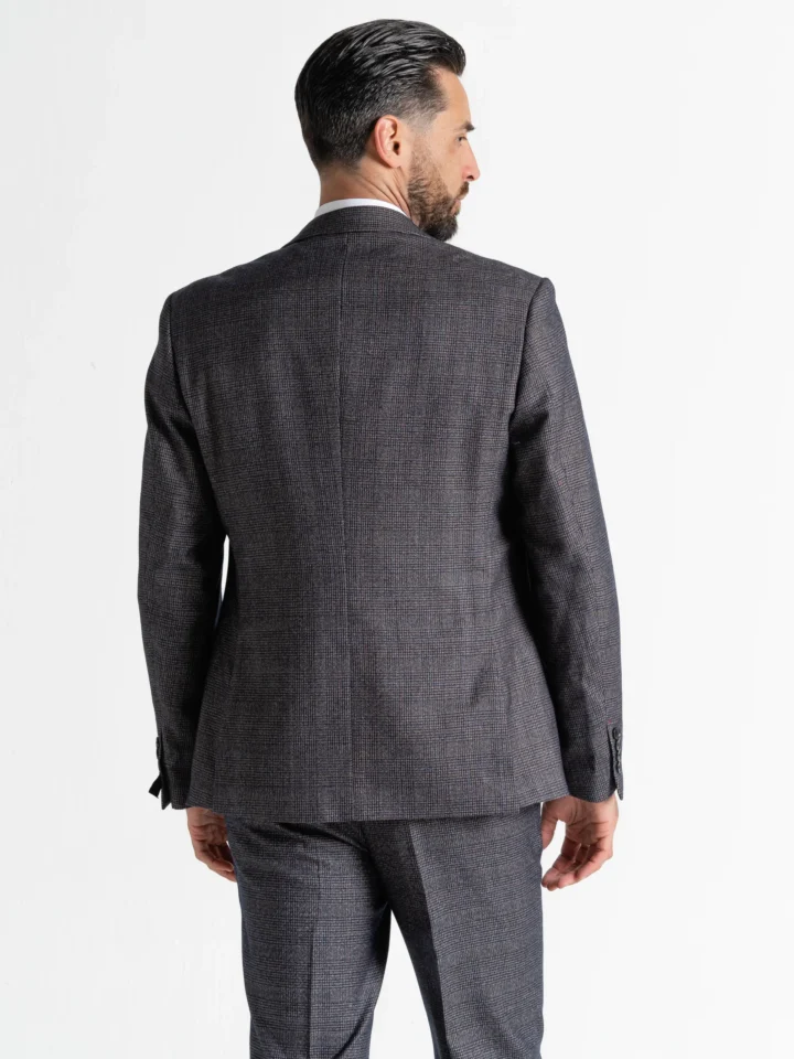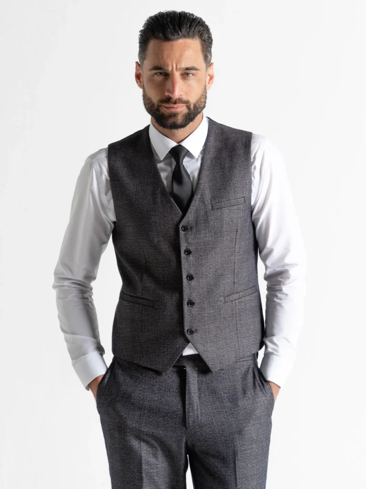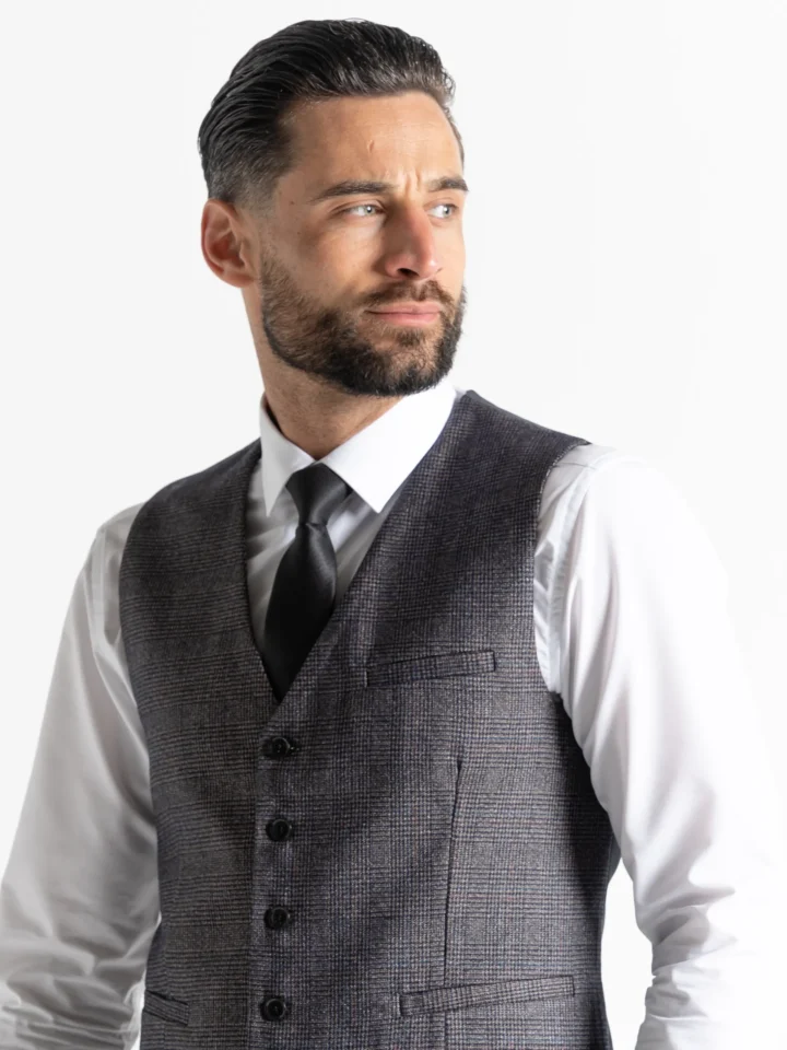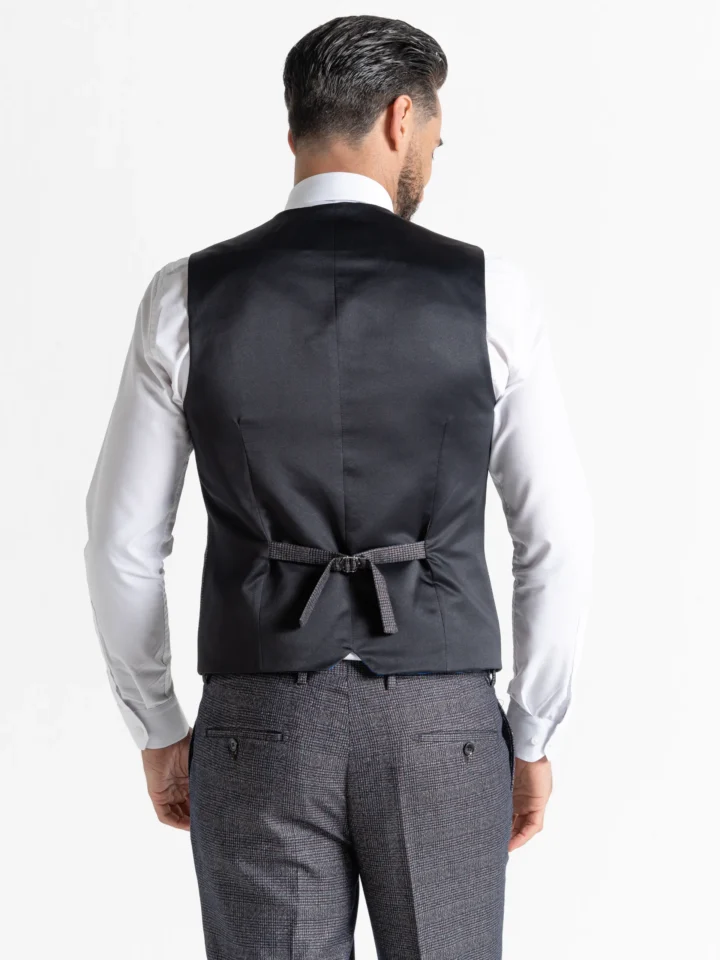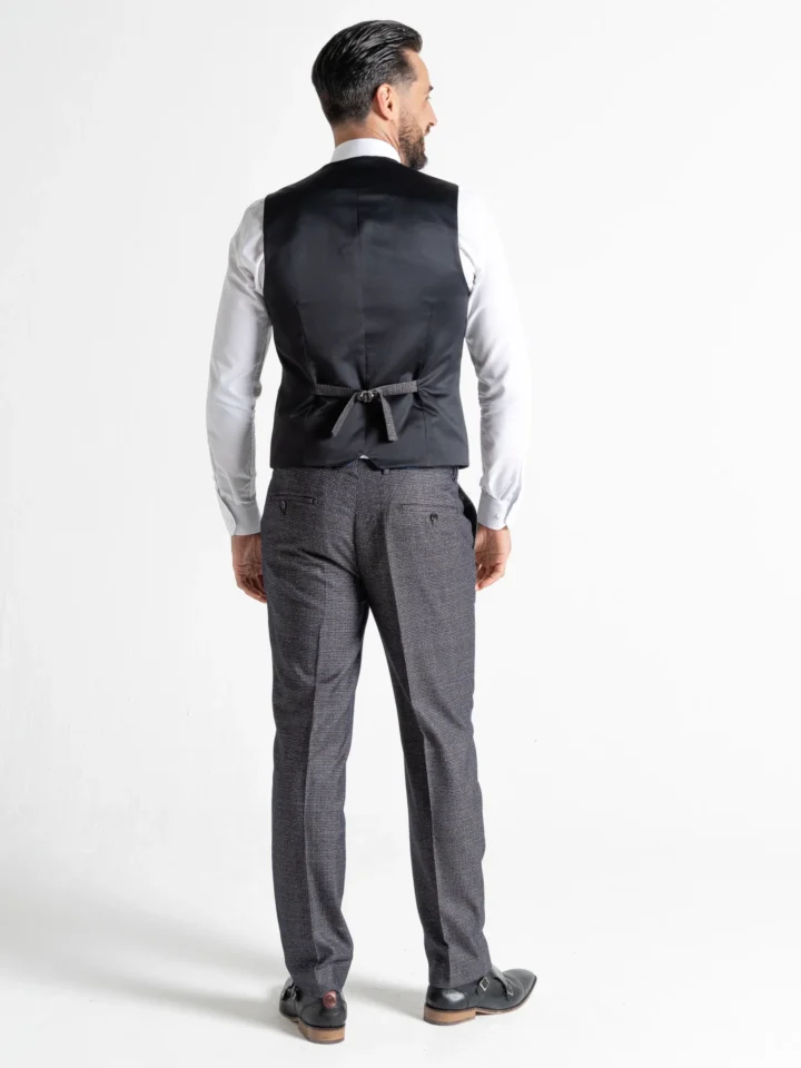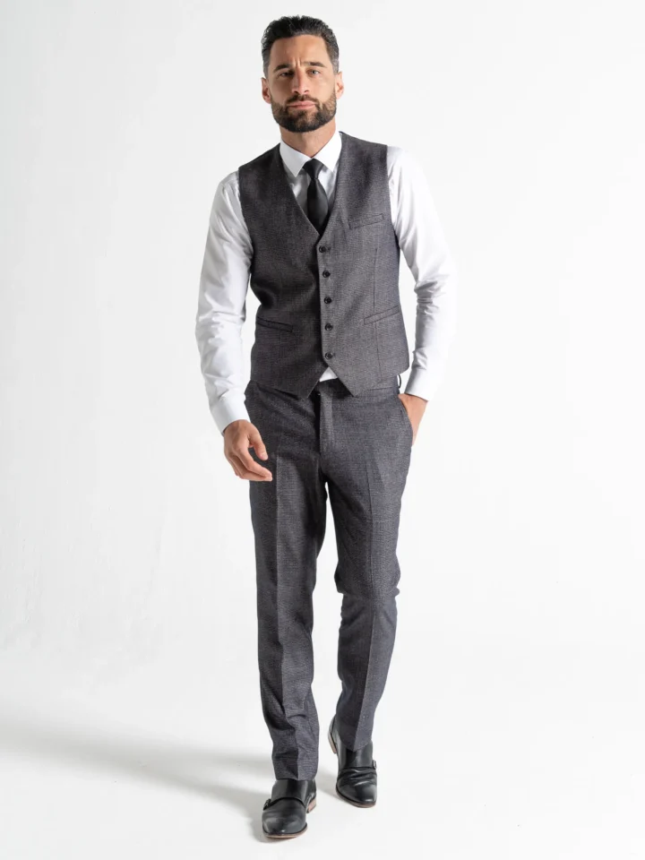 The Charles suit brings timeless elegance with a modern twist, featuring a rich black tweed fabric for a sophisticated and versatile finish. Expertly tailored for a seamless, contemporary slim fit, the single-breasted blazer is perfectly matched with a refined waistcoat and sharply cut trousers. The waistcoat’s adjustable back ensures a personalised fit, while the tapered trousers provide a clean, sophisticated silhouette.