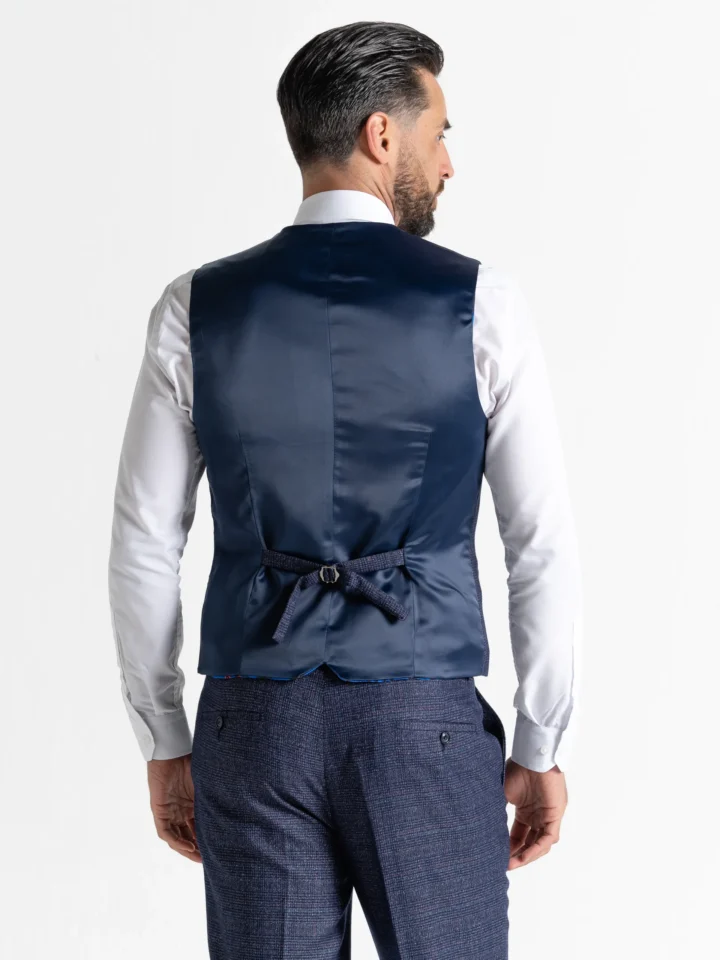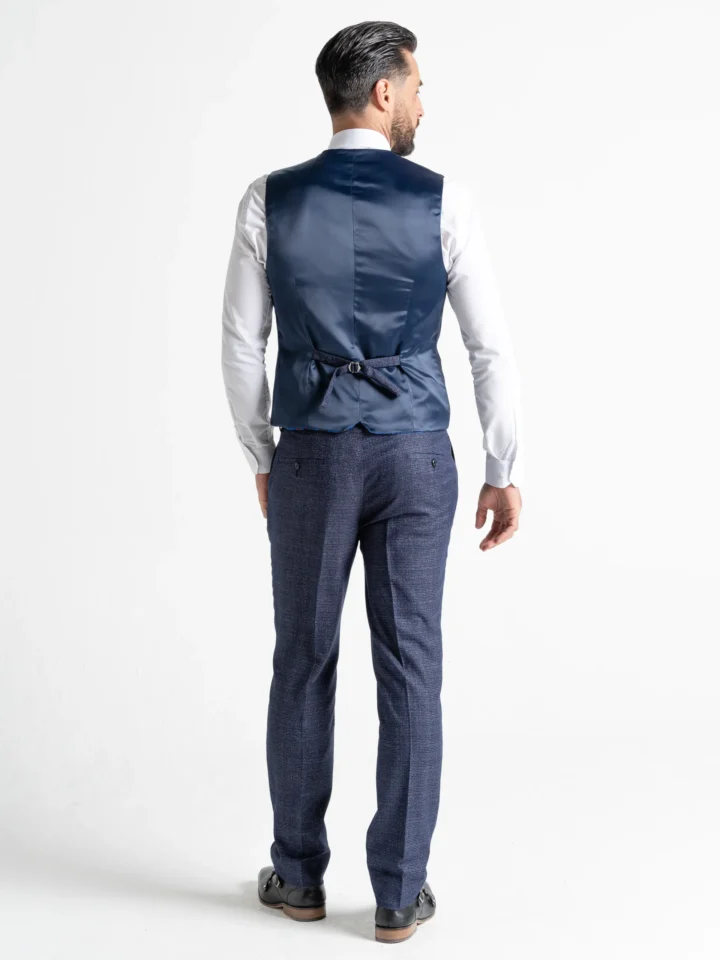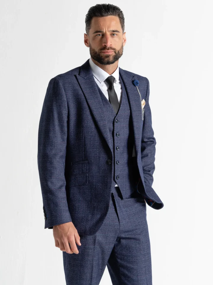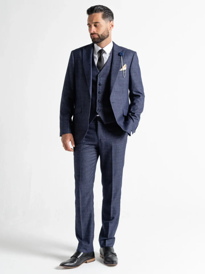 The Charles suit brings timeless elegance with a modern twist, featuring a textured blue tweed fabric that adds depth and character. Expertly tailored for a seamless, contemporary slim fit, the single-breasted blazer is perfectly matched with a refined waistcoat and sharply cut trousers. The waistcoat’s adjustable back ensures a personalised fit, while the tapered trousers provide a clean, sophisticated silhouette.