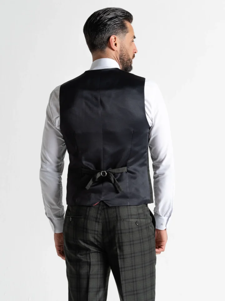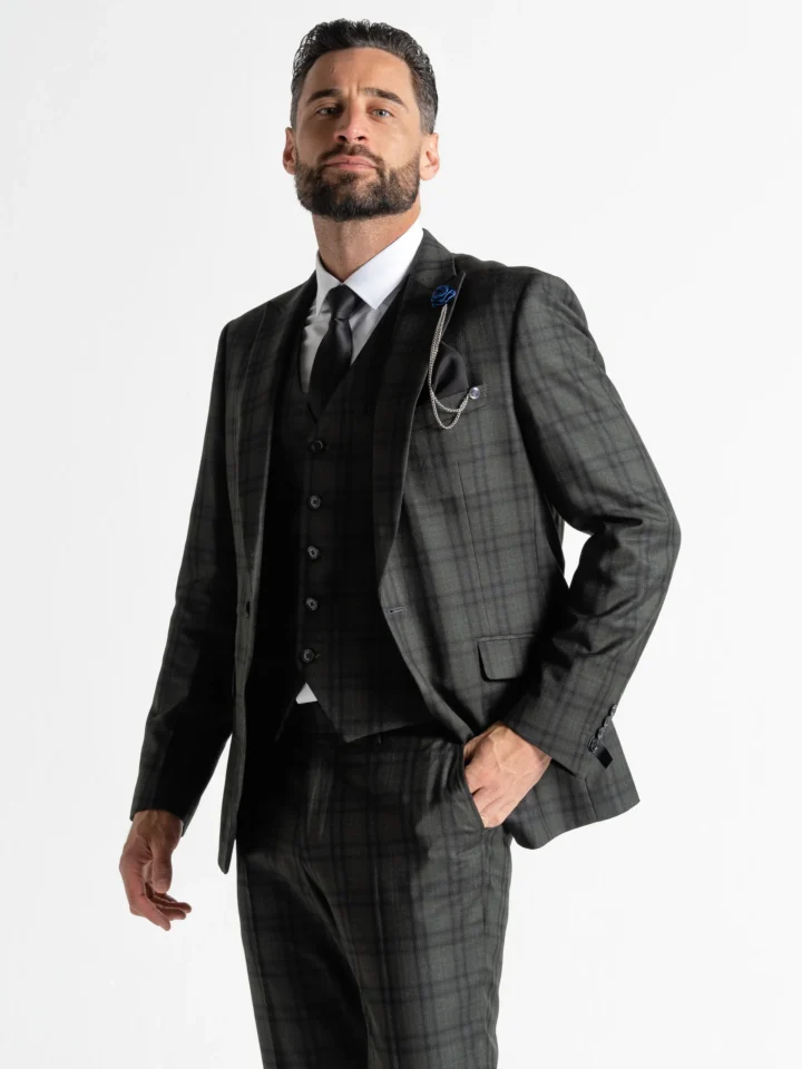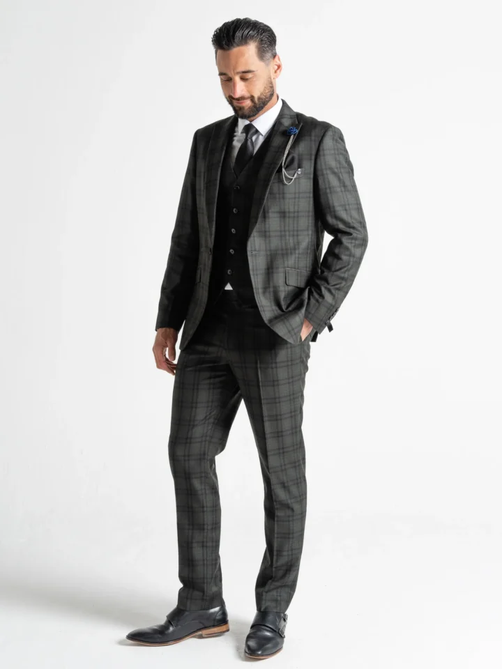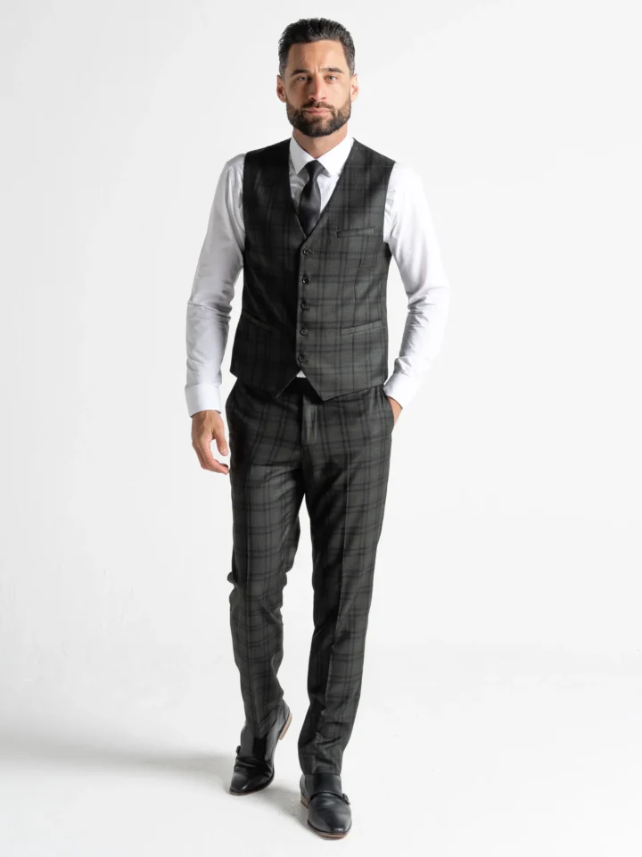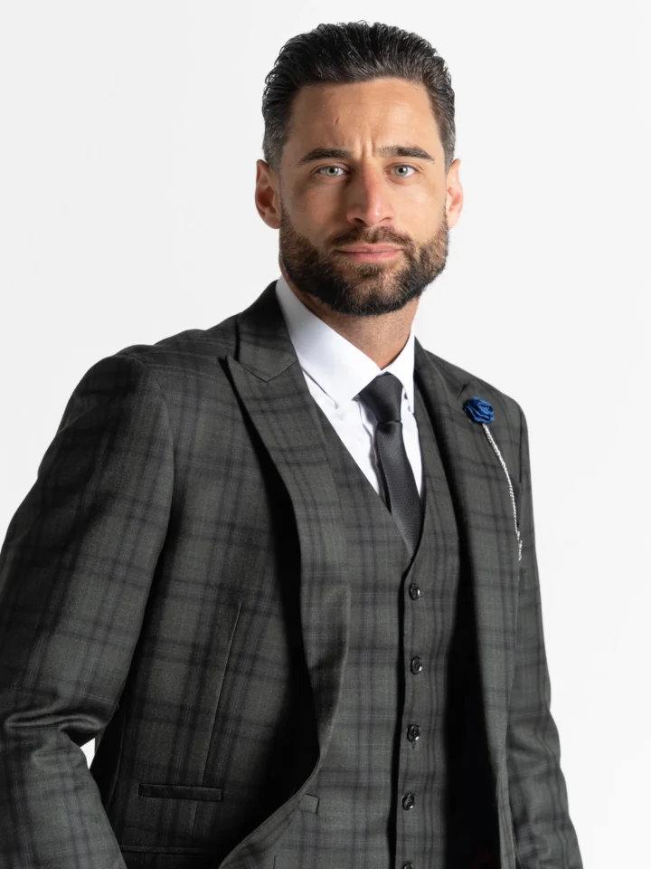 The Charles suit brings timeless elegance with a modern twist, featuring a deep dark green base accented by subtle black checks. Expertly tailored for a seamless, contemporary slim fit, the single-breasted blazer is perfectly matched with a refined waistcoat and sharply cut trousers. The waistcoat’s adjustable back ensures a personalised fit, while the tapered trousers provide a clean, sophisticated silhouette.