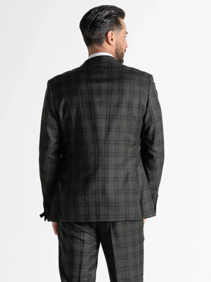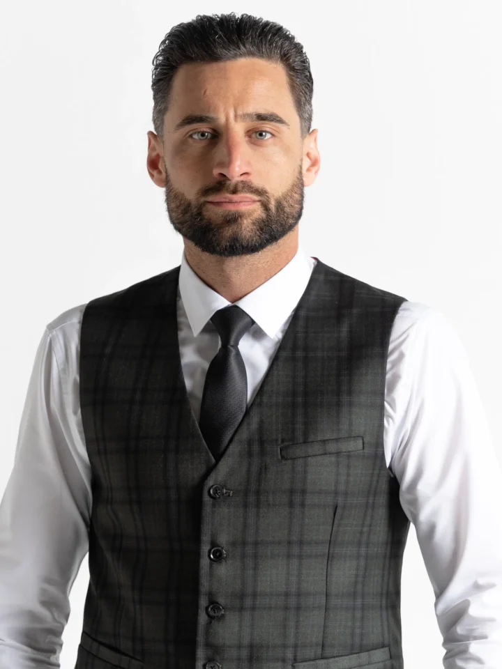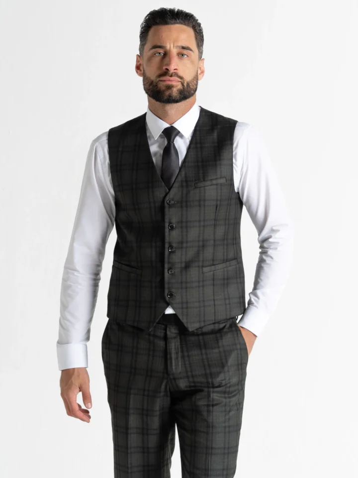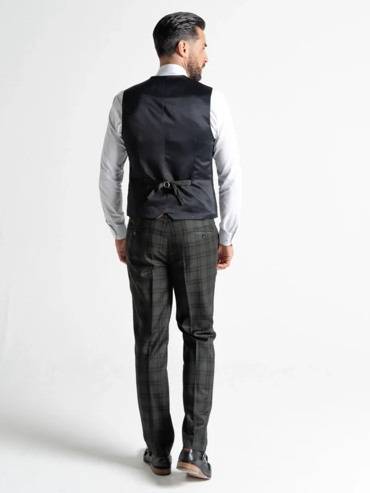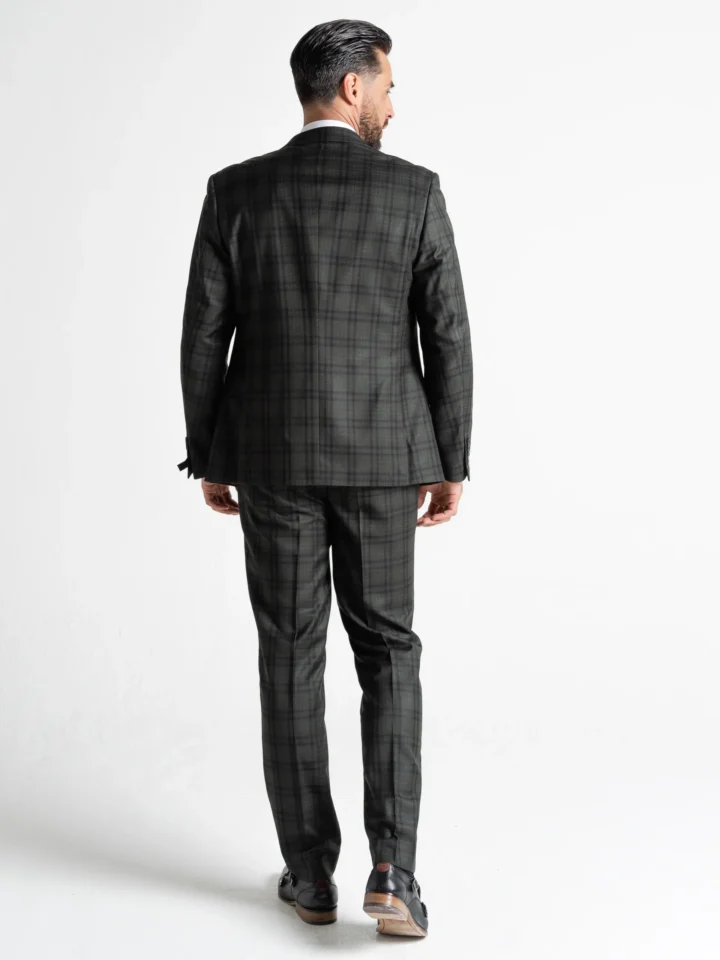 The Charles suit brings timeless elegance with a modern twist, featuring a deep dark green base accented by subtle black checks. Expertly tailored for a seamless, contemporary slim fit, the single-breasted blazer is perfectly matched with a refined waistcoat and sharply cut trousers. The waistcoat’s adjustable back ensures a personalised fit, while the tapered trousers provide a clean, sophisticated silhouette.