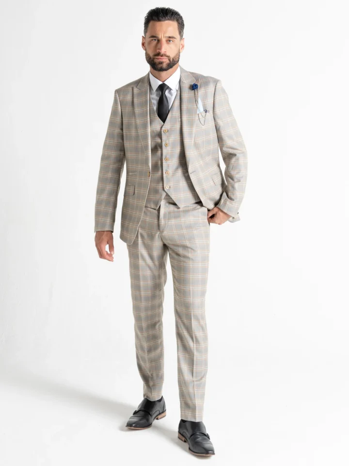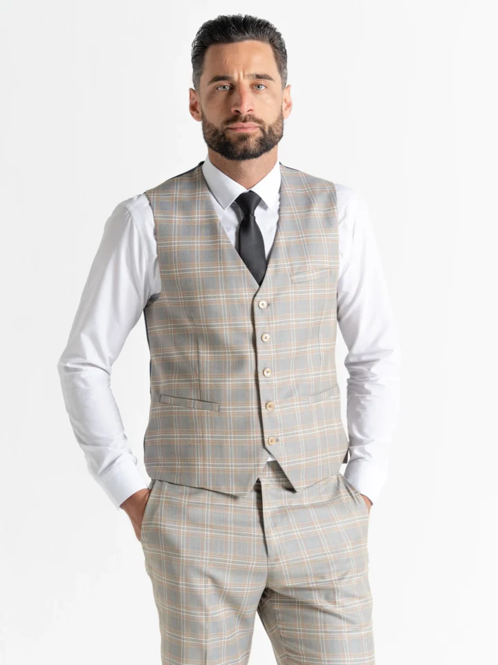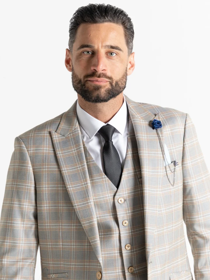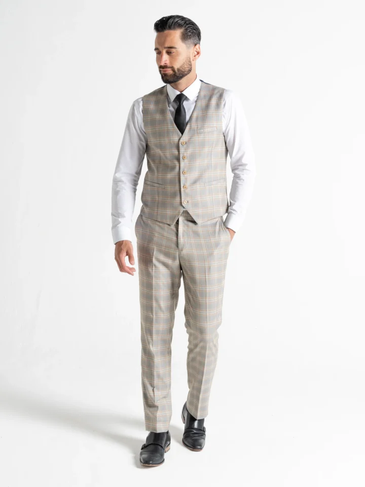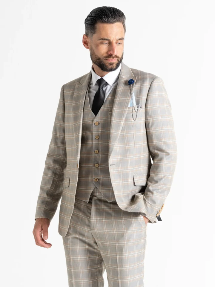 The Charles suit brings timeless elegance with a modern twist, featuring a fresh light grey base accented by refined white and caramel checks. Expertly tailored for a seamless, contemporary slim fit, the single-breasted blazer is perfectly matched with a refined waistcoat and sharply cut trousers. The waistcoat’s adjustable back ensures a personalised fit, while the tapered trousers provide a clean, sophisticated silhouette.