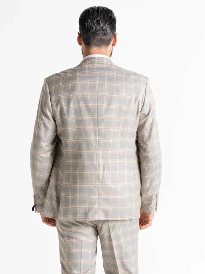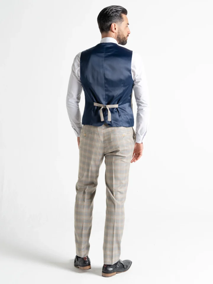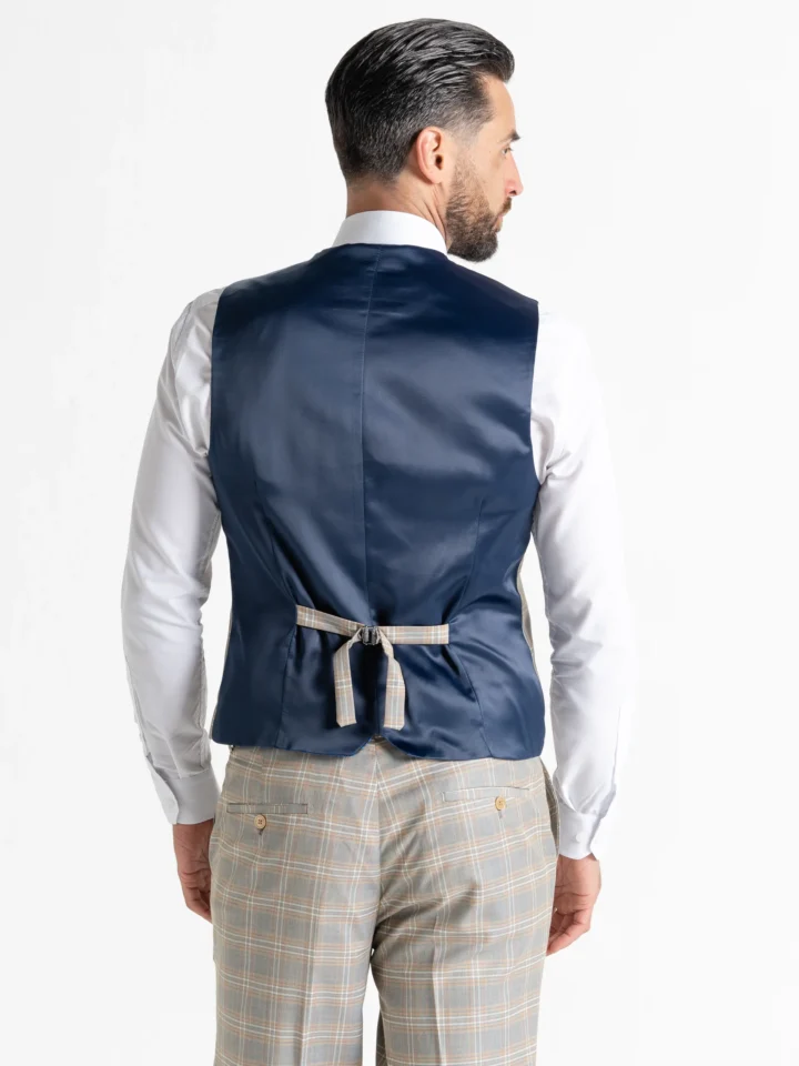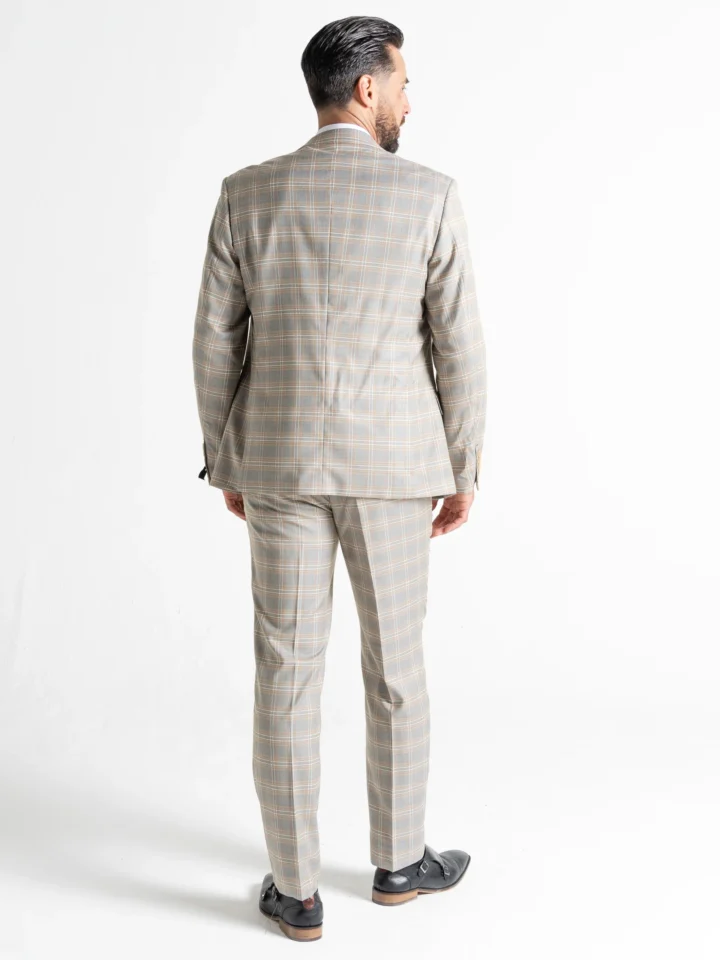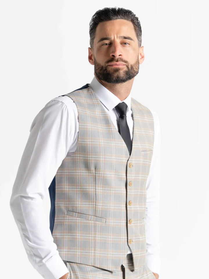 The Charles suit brings timeless elegance with a modern twist, featuring a fresh light grey base accented by refined white and caramel checks. Expertly tailored for a seamless, contemporary slim fit, the single-breasted blazer is perfectly matched with a refined waistcoat and sharply cut trousers. The waistcoat’s adjustable back ensures a personalised fit, while the tapered trousers provide a clean, sophisticated silhouette.