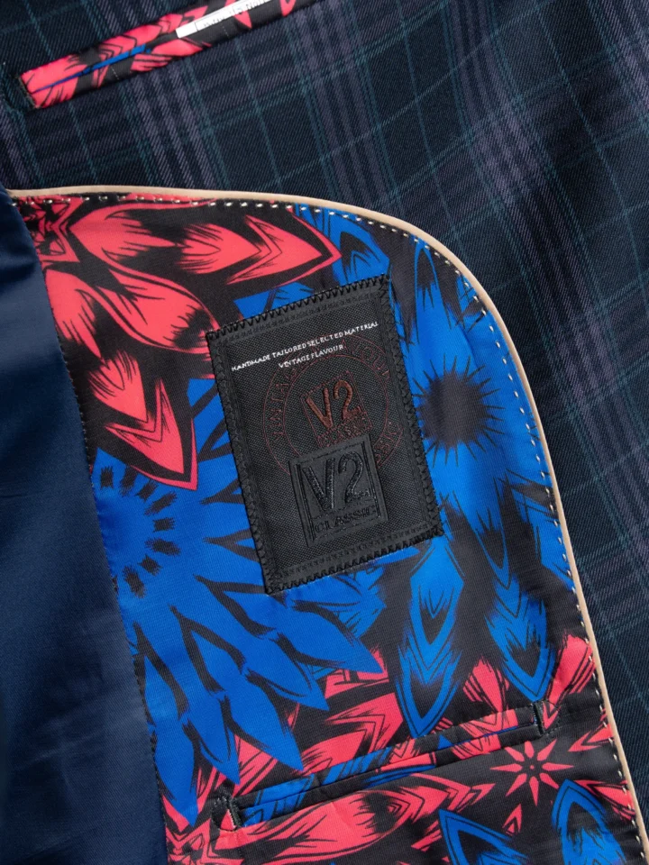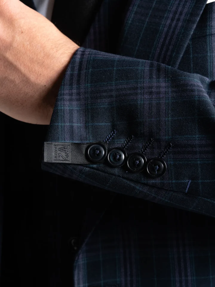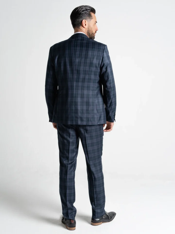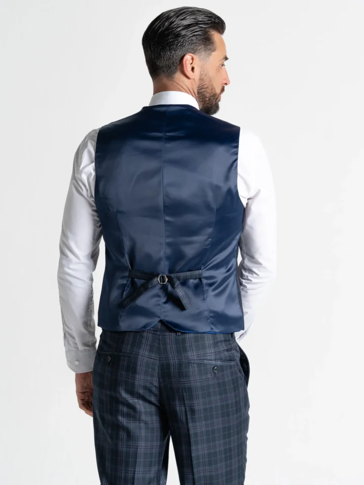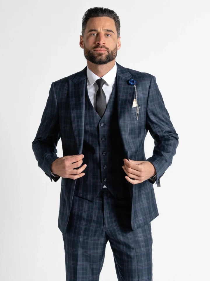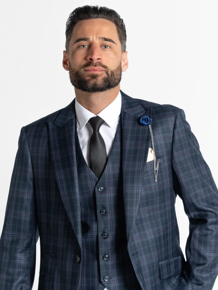 The Charles suit brings timeless elegance with a modern twist, featuring a deep navy base accented by subtle black and lilac checks. Expertly tailored for a seamless, contemporary slim fit, the single-breasted blazer is perfectly matched with a refined waistcoat and sharply cut trousers. The waistcoat’s adjustable back ensures a personalised fit, while the tapered trousers provide a clean, sophisticated silhouette.