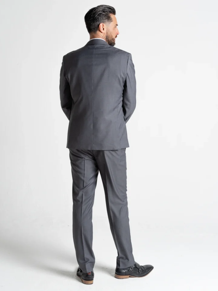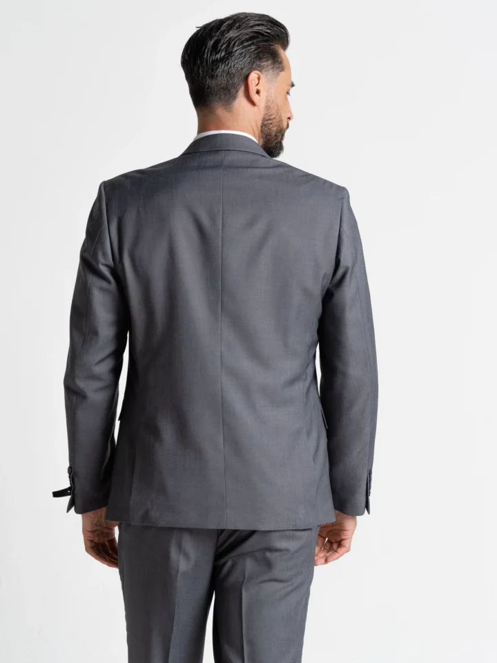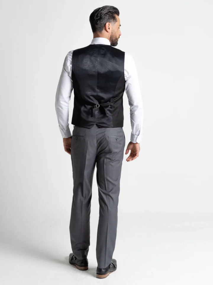 The elegant grey jacket features traditional notch lapels, a single-breasted closure, and functional internal pockets, delivering timeless style with practical details. The contrasting black waistcoat adds depth and refinement, complete with a sleek button front and adjustable back strap for a tailored fit. Coordinated grey trousers with a tapered leg complete the look with a crisp, polished finish.