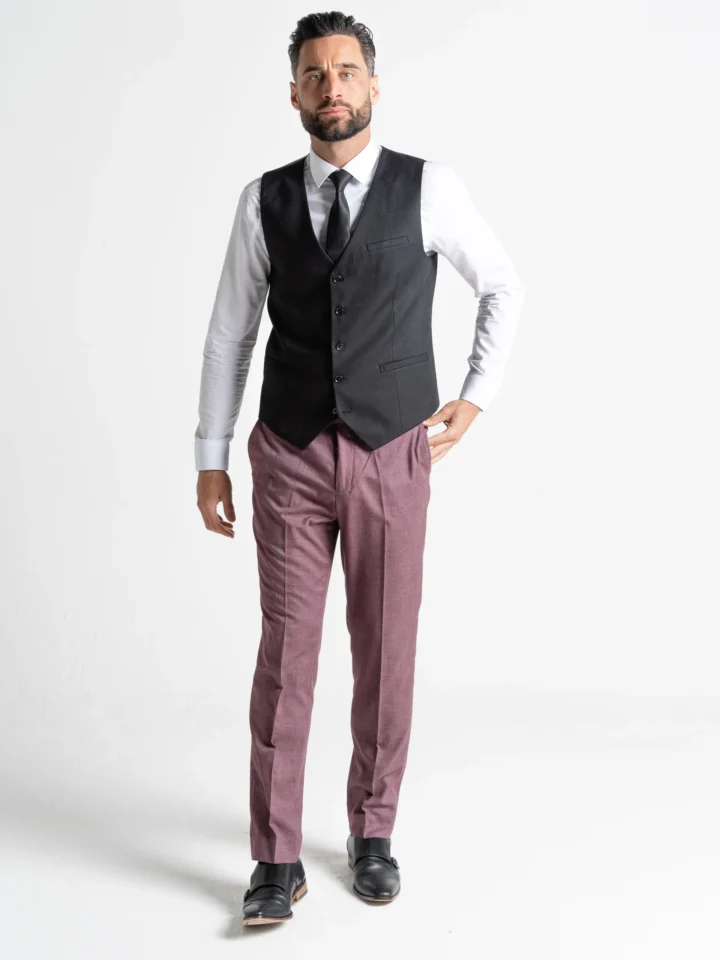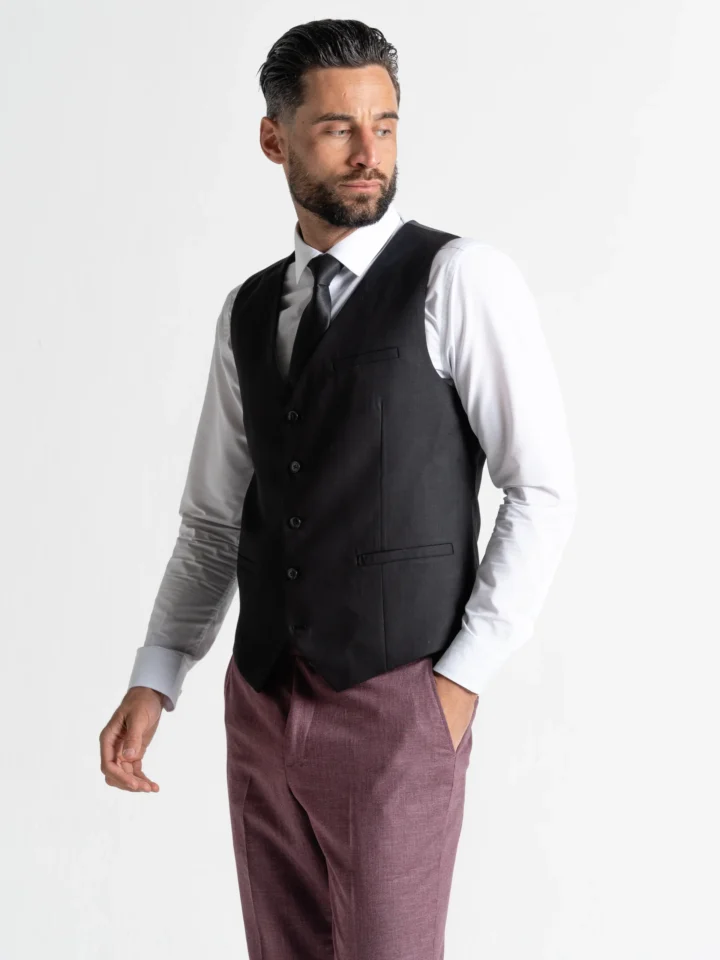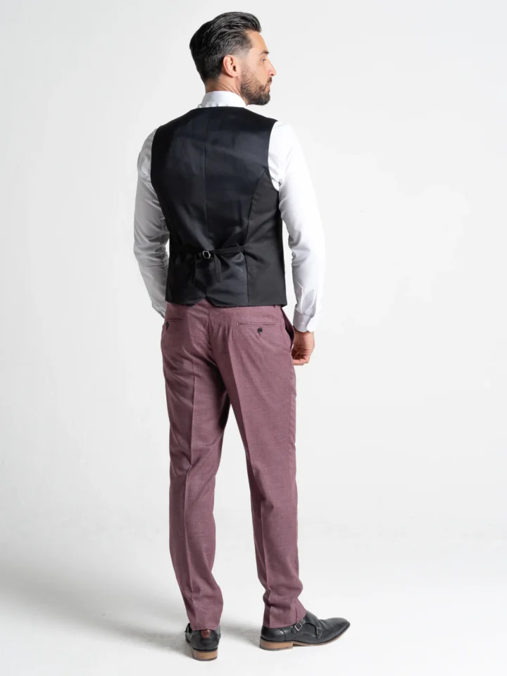 Complementing the blazer, the deep black waistcoat creates a striking contrast, elevating the ensemble’s sophistication. The waistcoat is tailored with a polished button front and an adjustable back strap, allowing for a personalised and flawless fit. The matching lilac trousers, with a tapered cut, complete the look by offering a streamlined and contemporary profile.