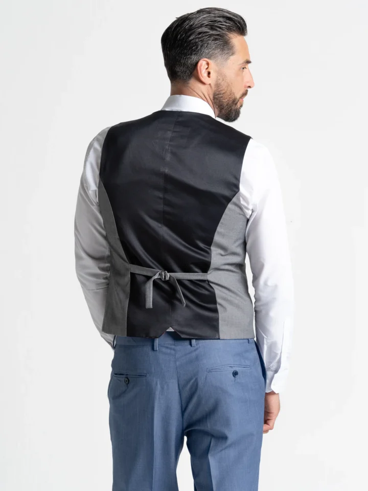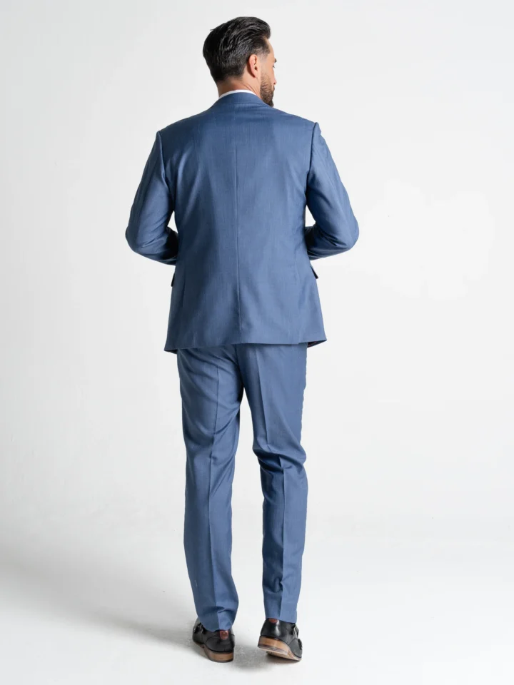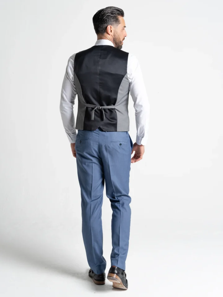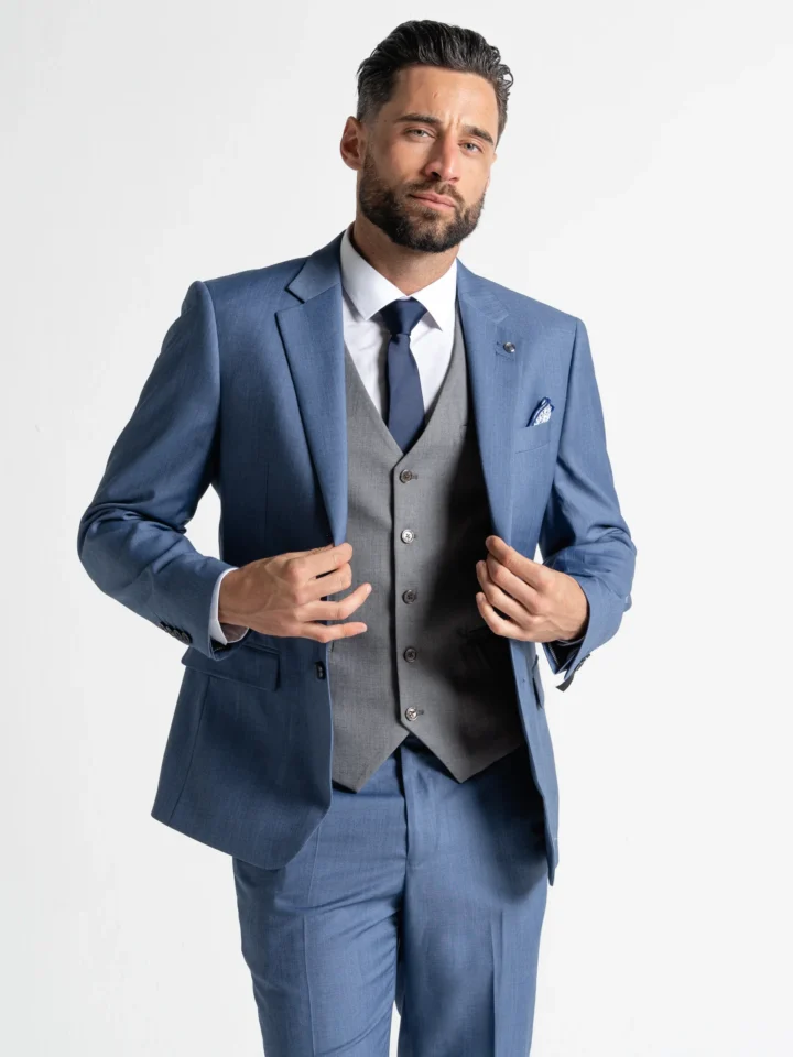 The rich blue blazer features traditional notch lapels, a single-breasted closure, and functional internal pockets, bringing timeless elegance to your look. Complemented by the soft grey waistcoat, which includes a sleek button front and adjustable back strap, this ensemble strikes the perfect balance of contrast and cohesion. Tailored blue trousers complete the set with a clean, tapered finish.