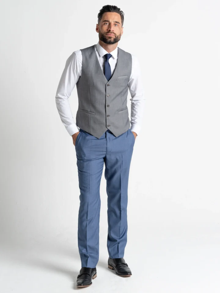 Step into effortless style with the Max Blue Blazer paired with a Grey Waistcoat — a refined combination that balances classic tones with contemporary tailoring. Designed with a modern slim fit, this three-piece suit offers a sharp silhouette and comfortable wear for all-day confidence.