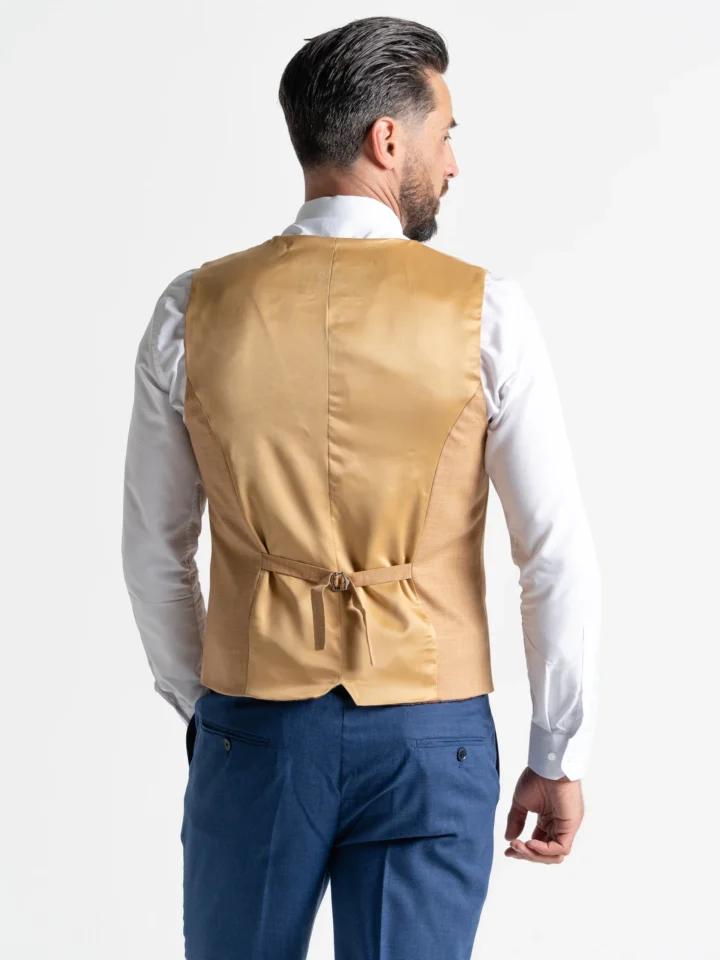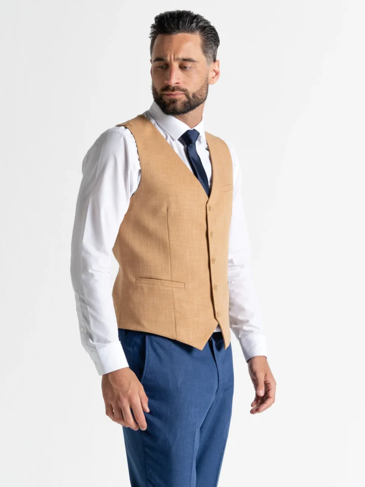 Make a bold and sophisticated statement with the Charlie Royal Blue Jacket paired with a Camel Waistcoat — a striking combination that blends vibrant colour with warm, earthy tones. Tailored to a modern slim fit, this three-piece suit is crafted to enhance your silhouette while ensuring all-day comfort.