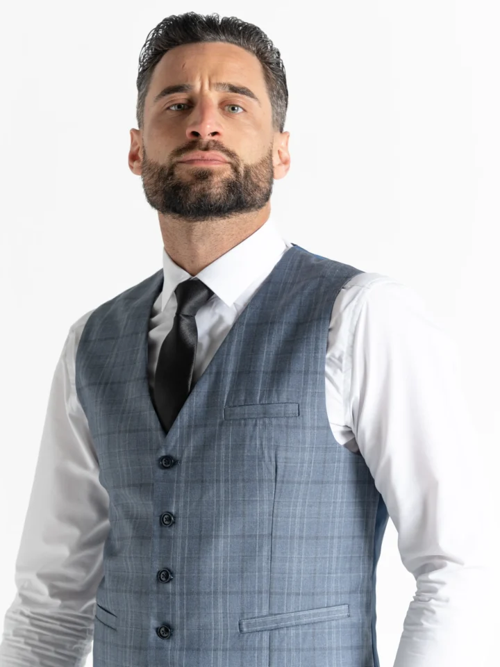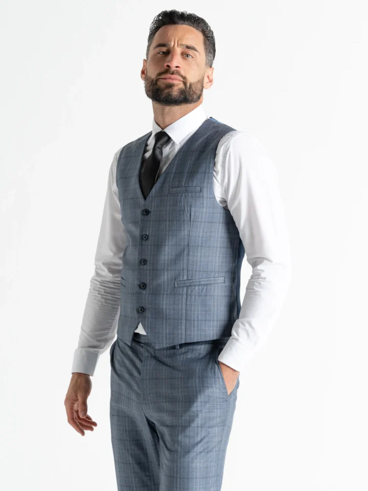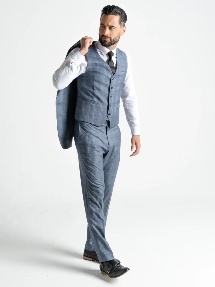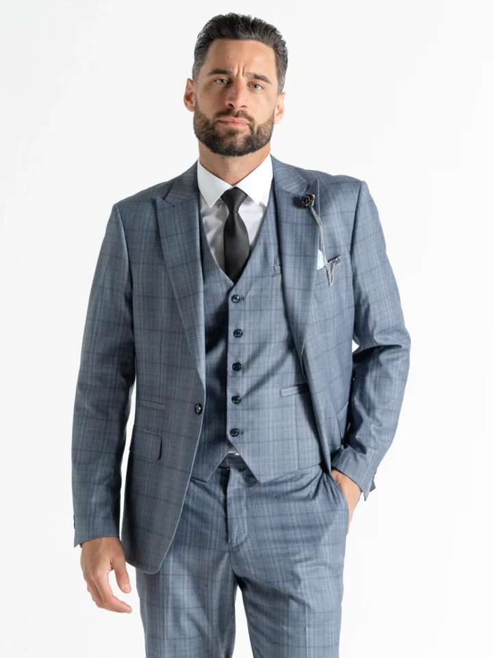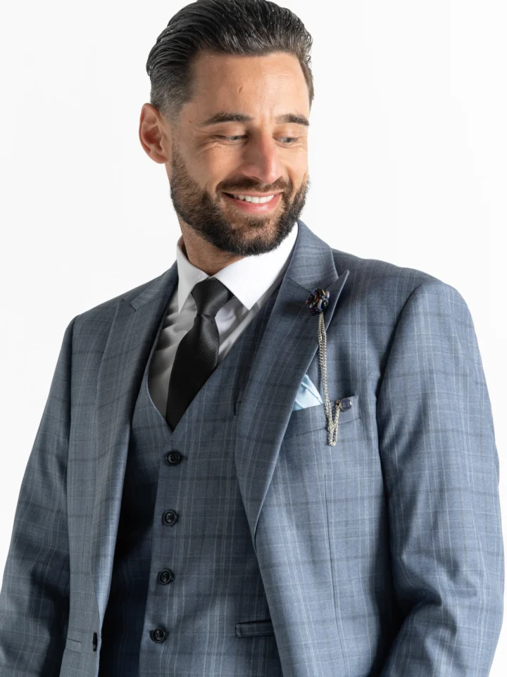 Bring a refined freshness to your formalwear with the Chelsea Light Blue with Grey & White Checks suit. The crisp light blue base is elevated by an intricate grey and white check pattern, offering a contemporary twist on classic tailoring that’s perfect for standing out with subtle elegance.