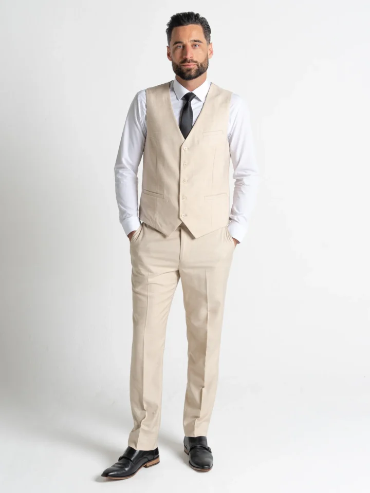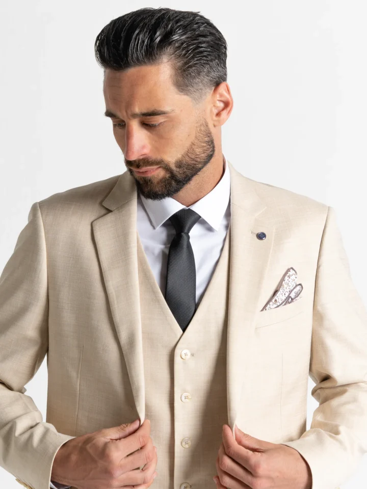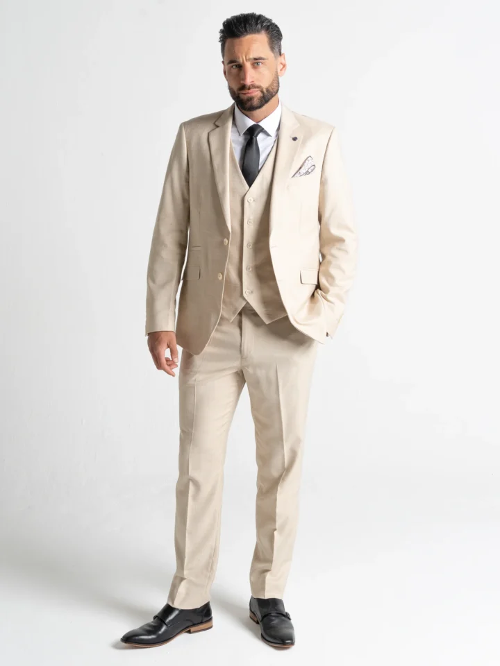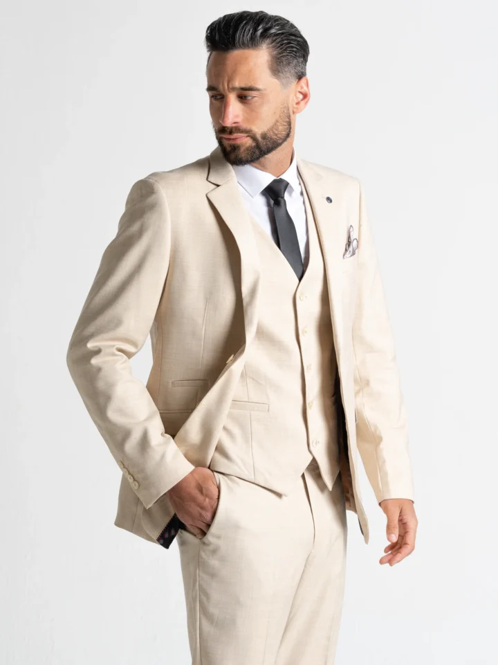 Embrace timeless elegance and refined sophistication with the Edward Cream Three-Piece Suit, meticulously crafted for the modern gentleman who values both style and comfort. Tailored to perfection with a contemporary slim fit, this luxurious ensemble features a structured jacket designed with classic notch lapels and a crisp single-breasted closure, exuding a sense of polished confidence.