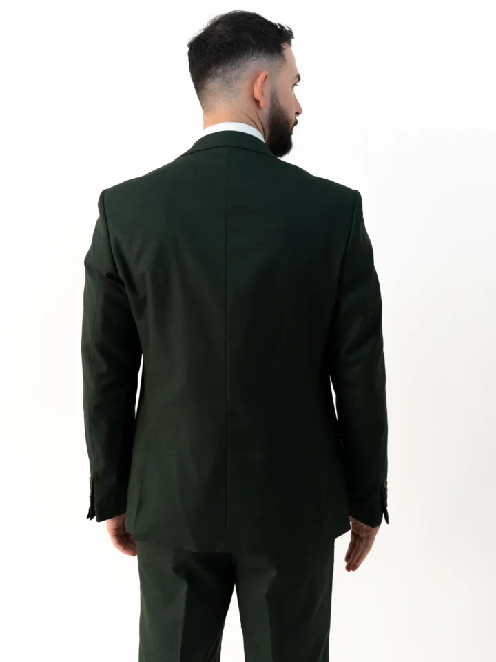 Make a striking impression with the Edward Emerald Green Three-Piece Suit, expertly tailored for a sharp, modern slim fit. This standout ensemble features a structured jacket with classic notch lapels and a refined single-breasted closure, complemented by a matching waistcoat with a sleek button front and adjustable back strap for a flawless fit. The tailored trousers complete the look with a clean, tapered silhouette designed for both style and comfort.