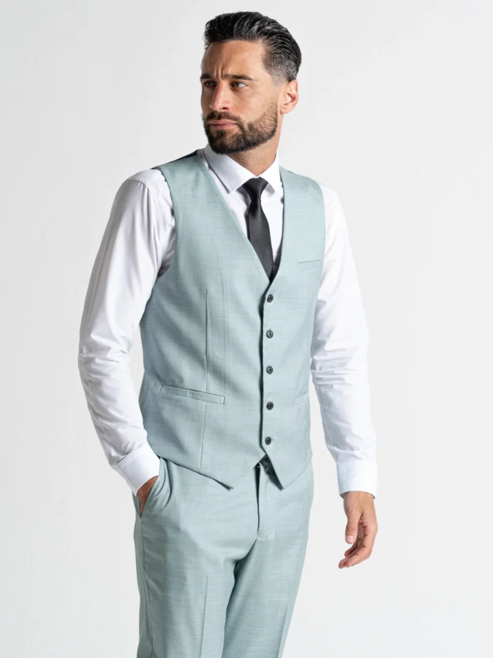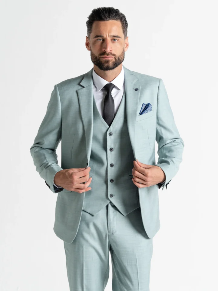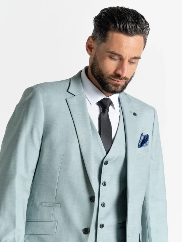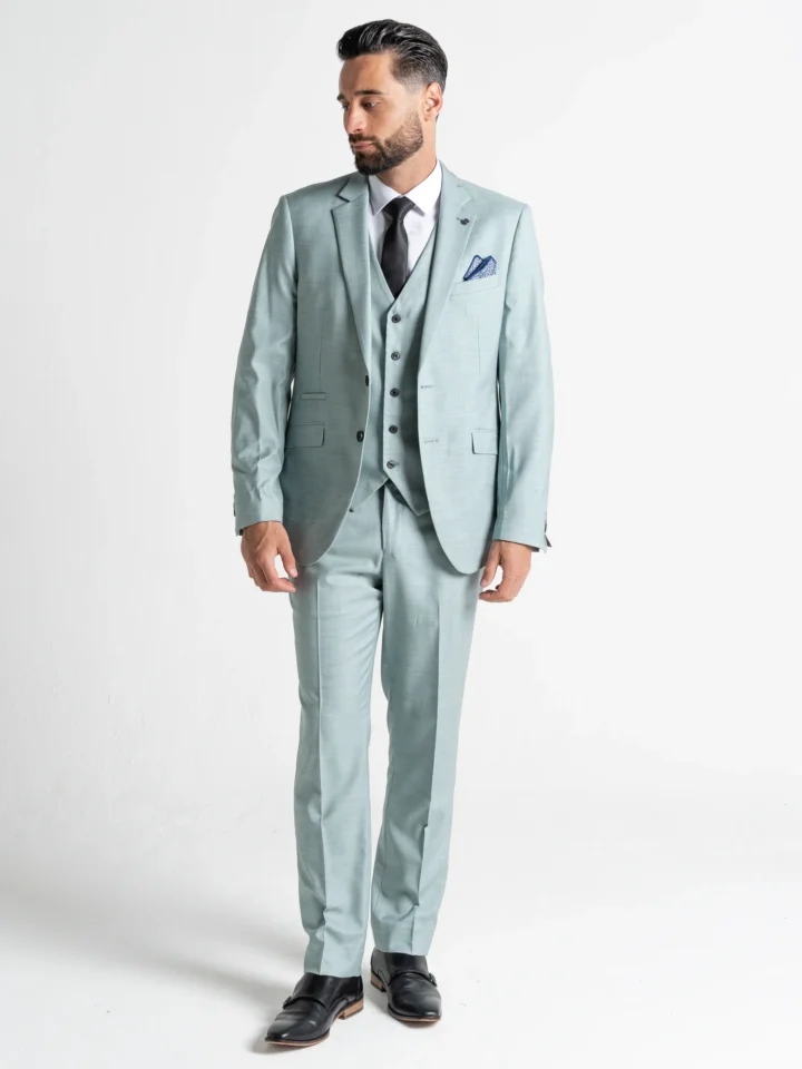Make a vibrant yet sophisticated statement with the Edward Mint Three-Piece Suit, expertly tailored for a modern slim fit. This standout ensemble features a structured jacket with classic notch lapels and a single-breasted closure, paired with a coordinating waistcoat featuring a sleek button front and adjustable back strap. The tailored trousers complete the look with a clean, tapered silhouette.