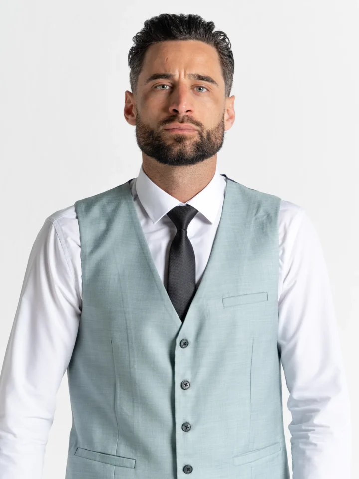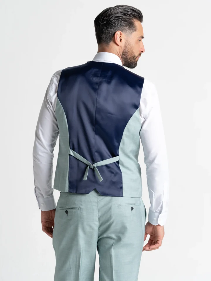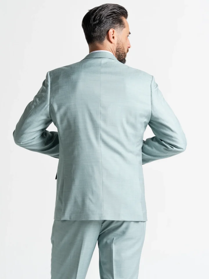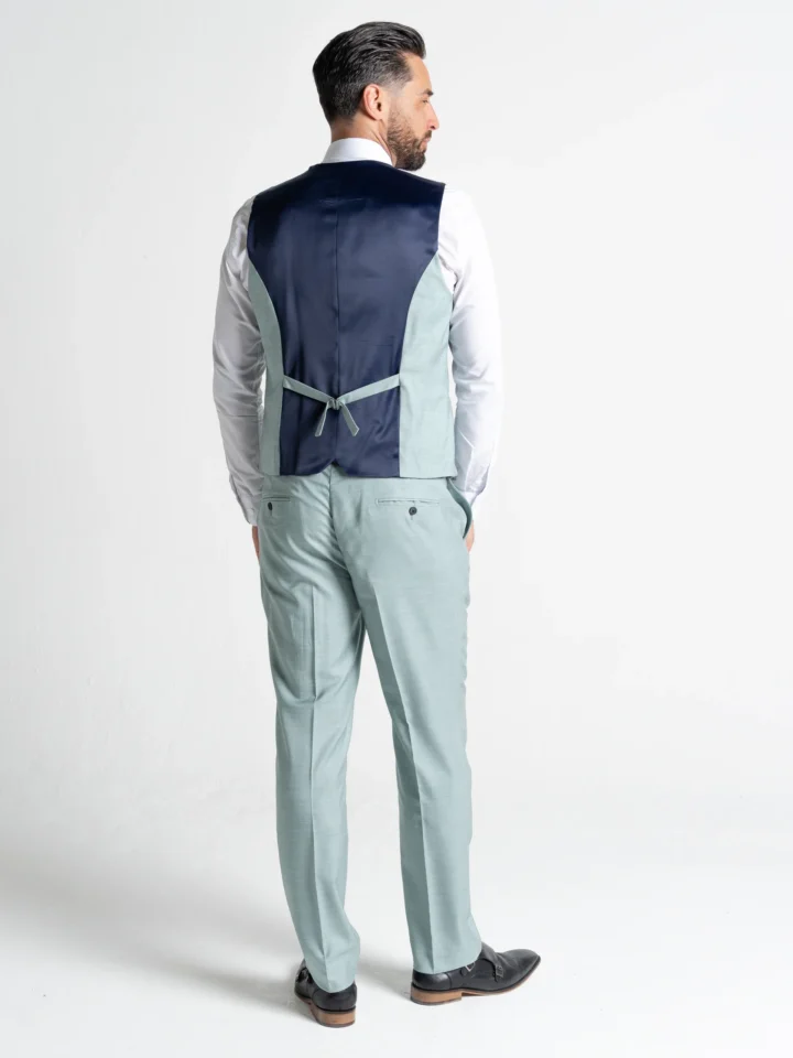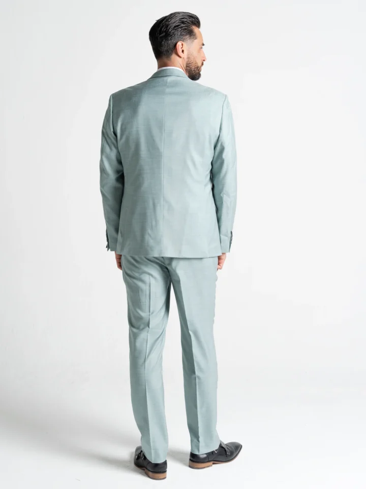 Make a vibrant yet sophisticated statement with the Edward Mint Three-Piece Suit, expertly tailored for a modern slim fit. This standout ensemble features a structured jacket with classic notch lapels and a single-breasted closure, paired with a coordinating waistcoat featuring a sleek button front and adjustable back strap. The tailored trousers complete the look with a clean, tapered silhouette.
