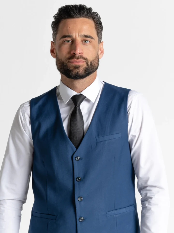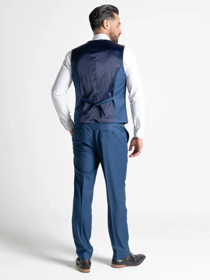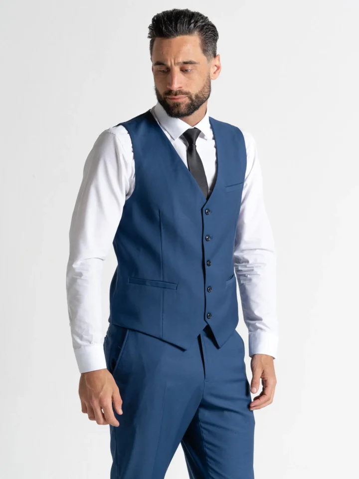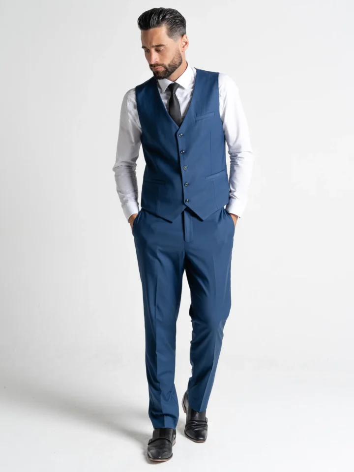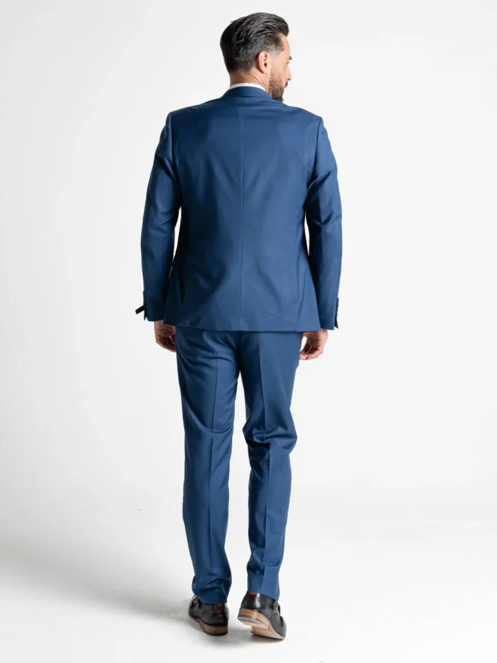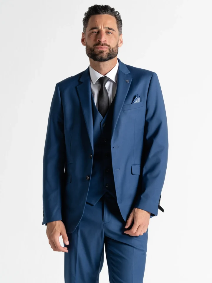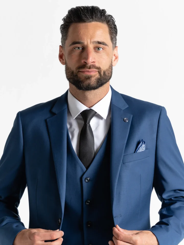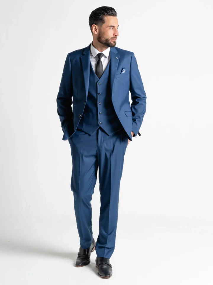 Elevate your formal wardrobe with the Haris Blue Three-Piece Suit — a perfect blend of modern elegance and tailored precision. Cut to a contemporary slim fit, this ensemble is designed to create a sharp, confident silhouette while offering lasting comfort.