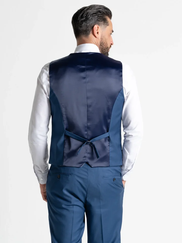 The structured jacket features classic notch lapels, a single-breasted closure, and practical internal pockets for discreet functionality. The matching waistcoat, with its refined button front and adjustable back strap, provides a personalised fit, while the tailored trousers, finished with a tapered leg, complete the look with a clean, modern edge.