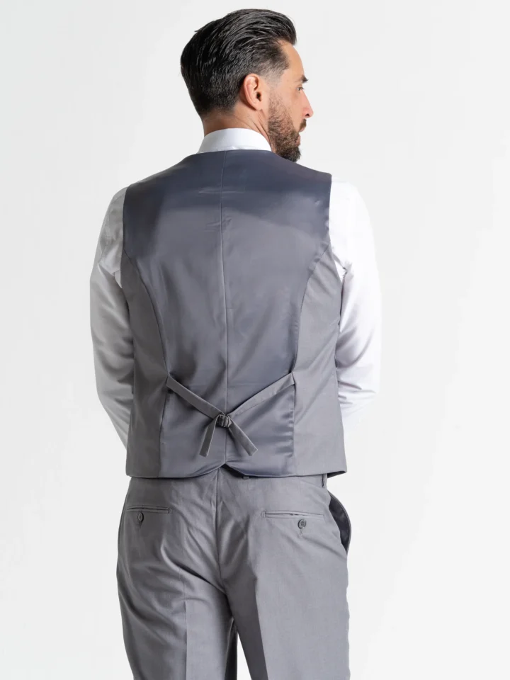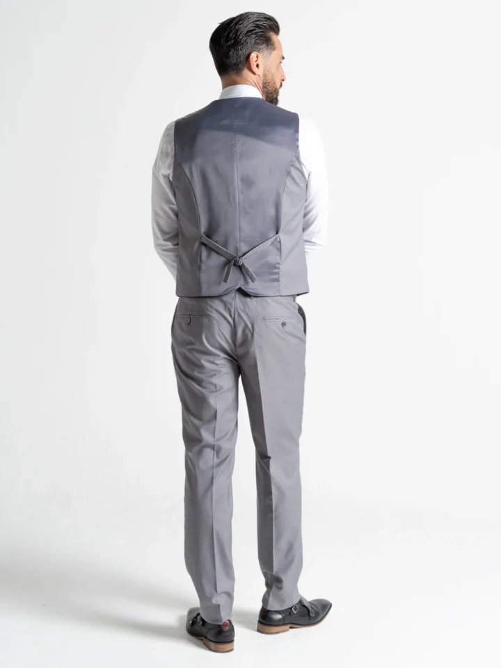 The structured jacket showcases classic notch lapels, a single-breasted closure, and functional internal pockets for refined practicality. The coordinating waistcoat, featuring a sleek button front and adjustable back strap, ensures a personalised fit, while the tapered trousers complete the look with a clean, tailored finish.