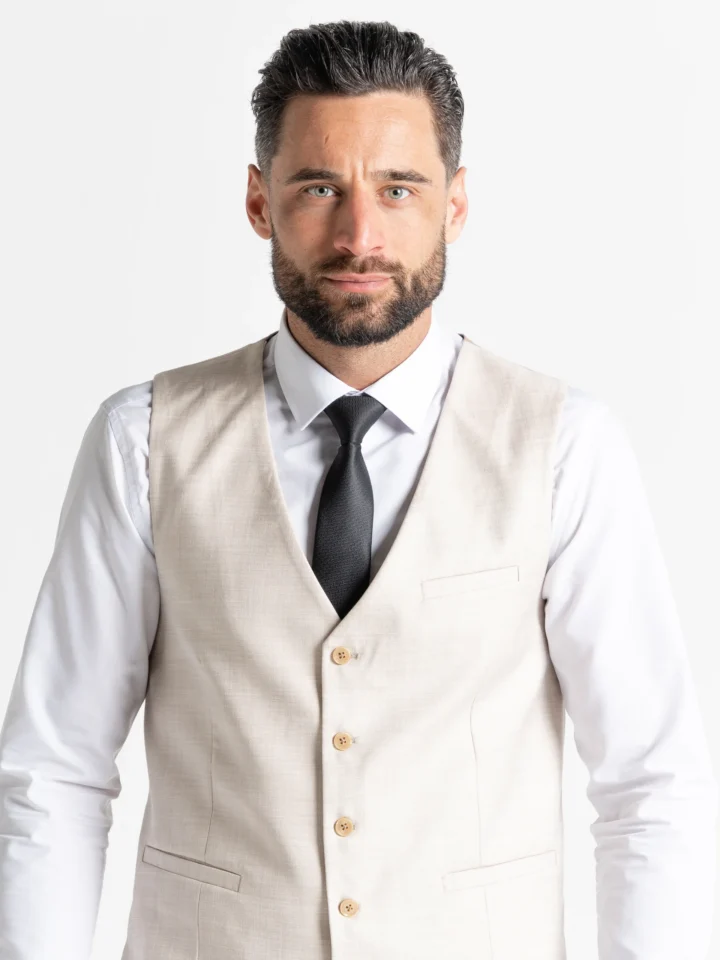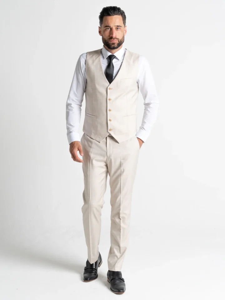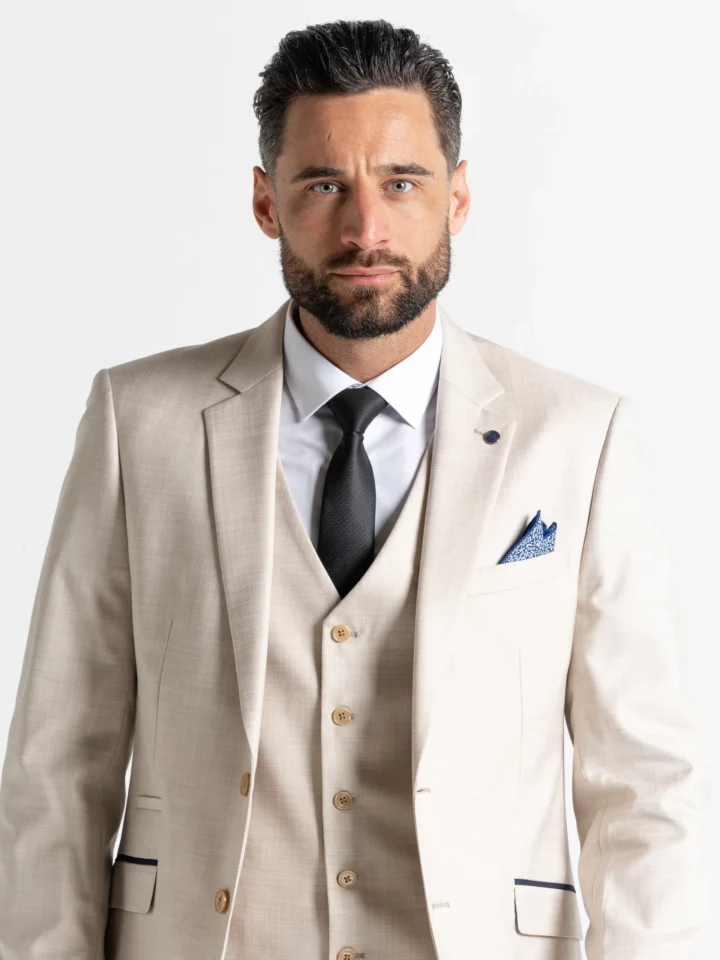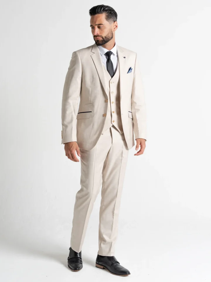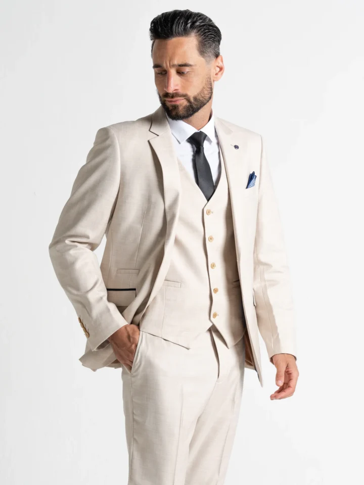 Make a confident and stylish impression with the Henry Cream Three Piece Suit. Expertly tailored for a contemporary slim fit, this versatile suit combines timeless elegance with modern detailing. The structured jacket, complete with classic notch lapels, single-breasted closure, and practical internal pockets, pairs effortlessly with the refined waistcoat featuring a sleek button front and adjustable back strap. Tailored trousers complete the ensemble, crafted with precision for comfort and a sharp silhouette.