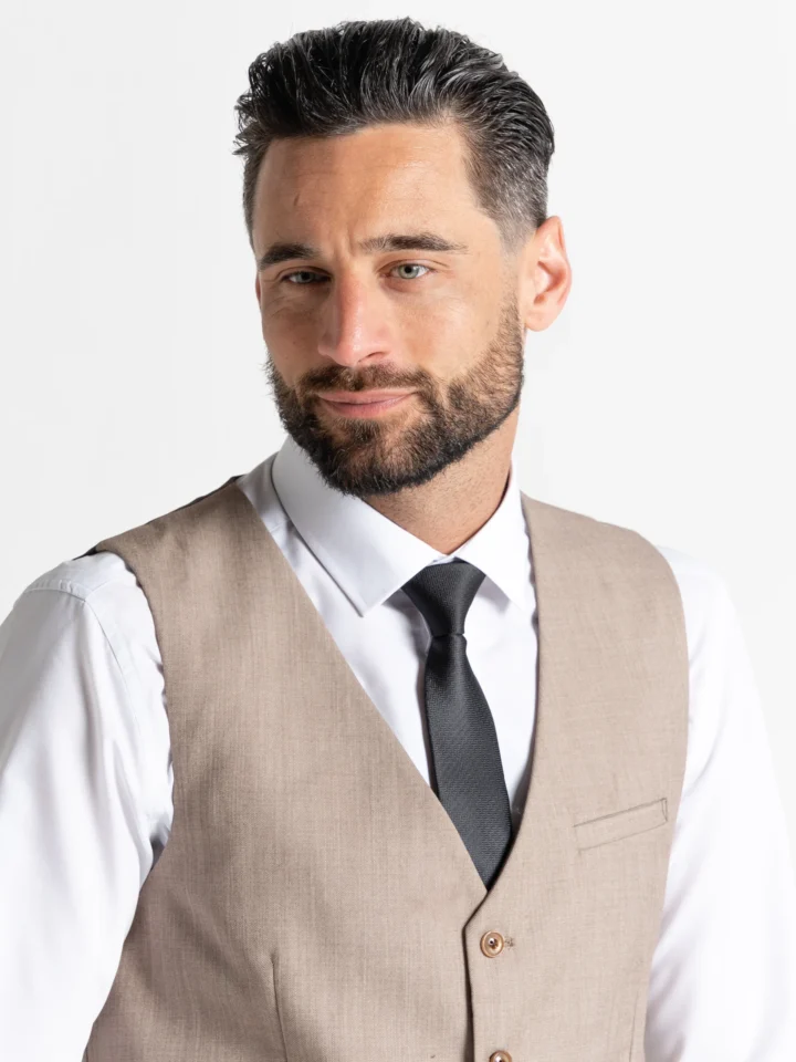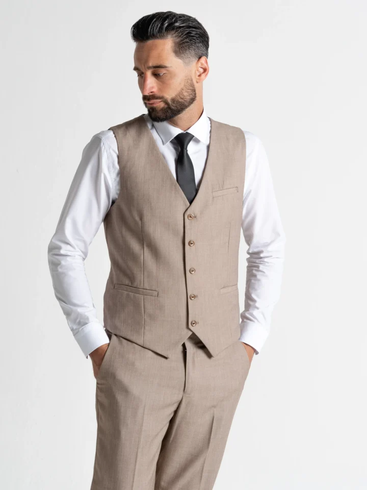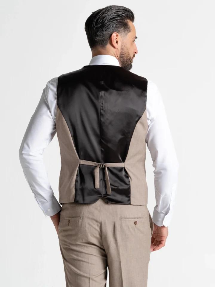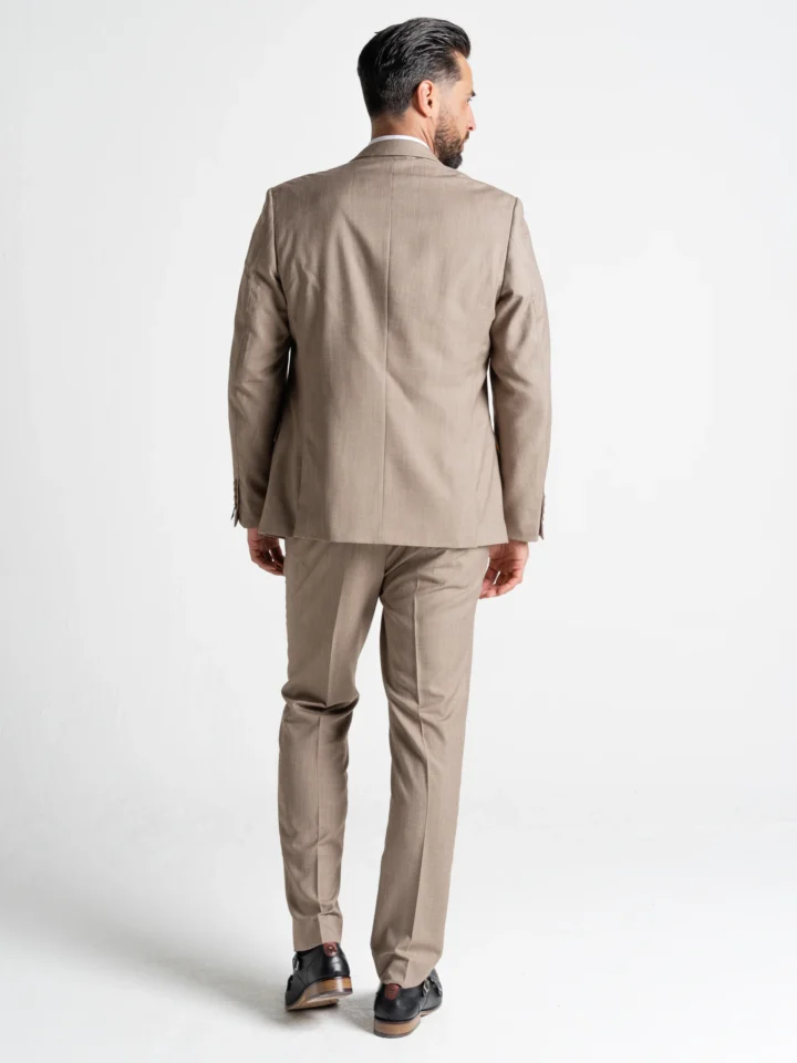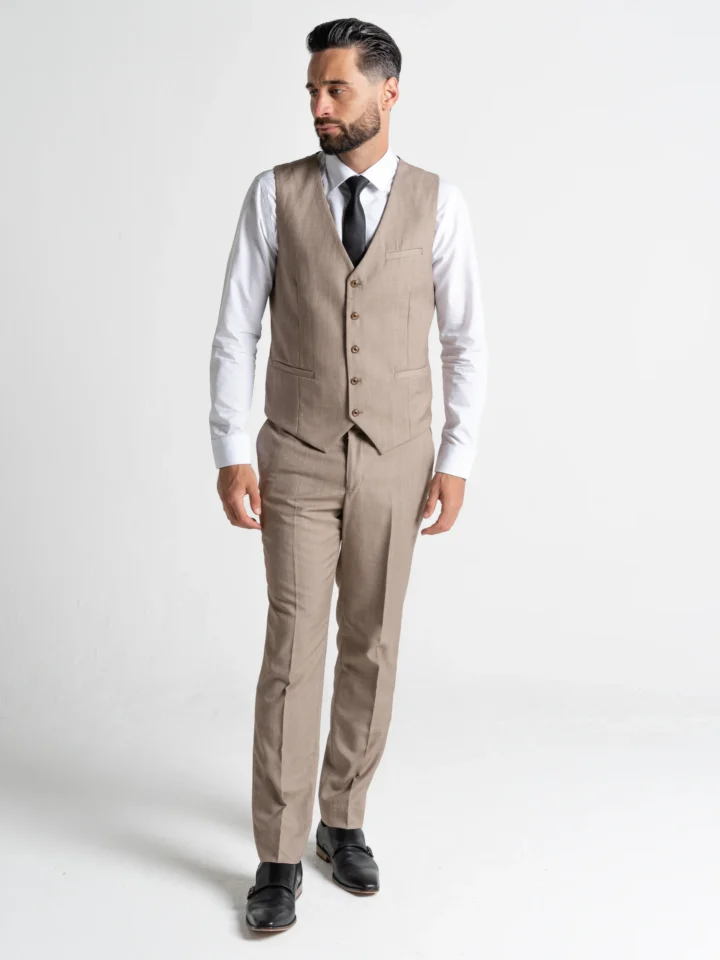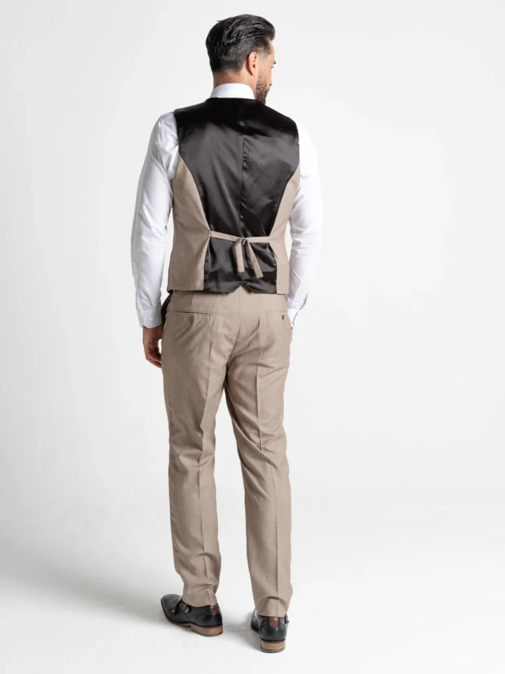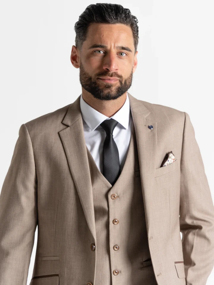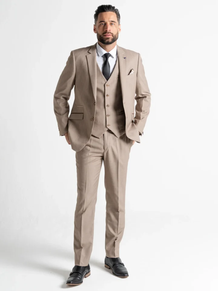 Make a confident and stylish impression with the Henry Light Brown Three Piece Suit. Expertly tailored for a contemporary slim fit, this versatile suit combines timeless elegance with modern detailing. The structured jacket, complete with classic notch lapels, single-breasted closure, and practical internal pockets, pairs effortlessly with the refined waistcoat featuring a sleek button front and adjustable back strap. Tailored trousers complete the ensemble, crafted with precision for comfort and a sharp silhouette.
