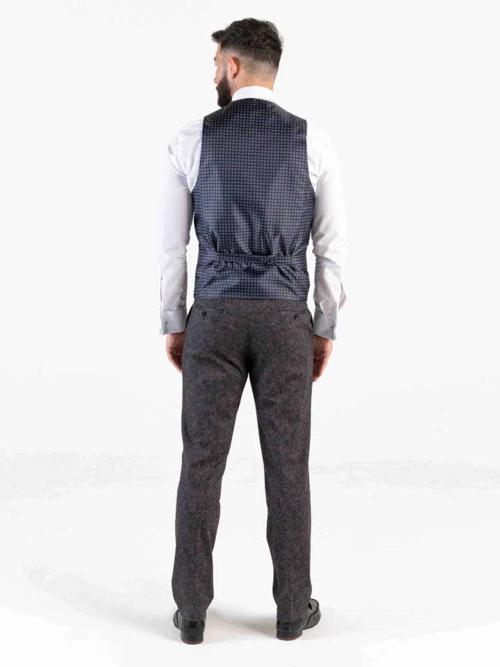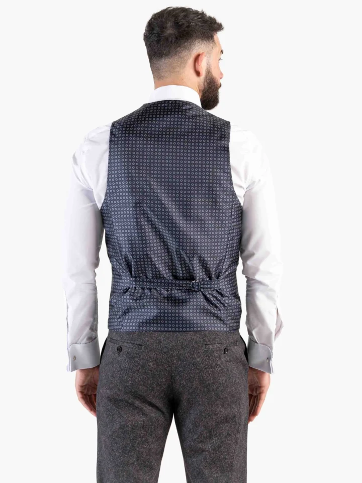 This herringbone three piece is an ideal British wardrobe addition. Finished with a matching four welted waistcoat, and tailored fit grey trousers. Pair with a black silk tie to complete the look.