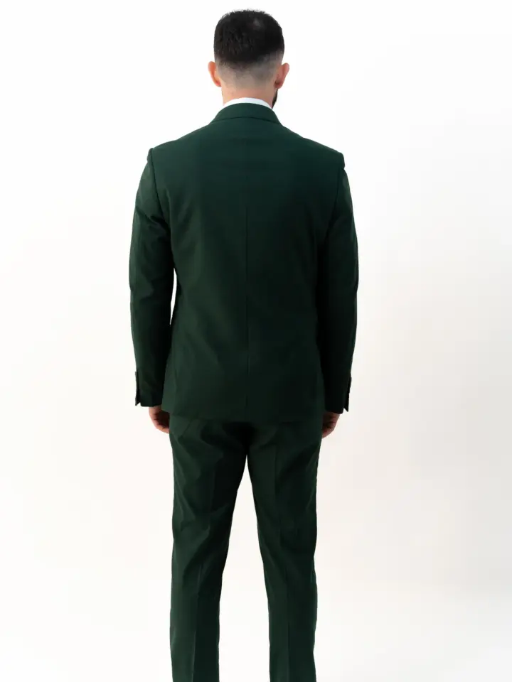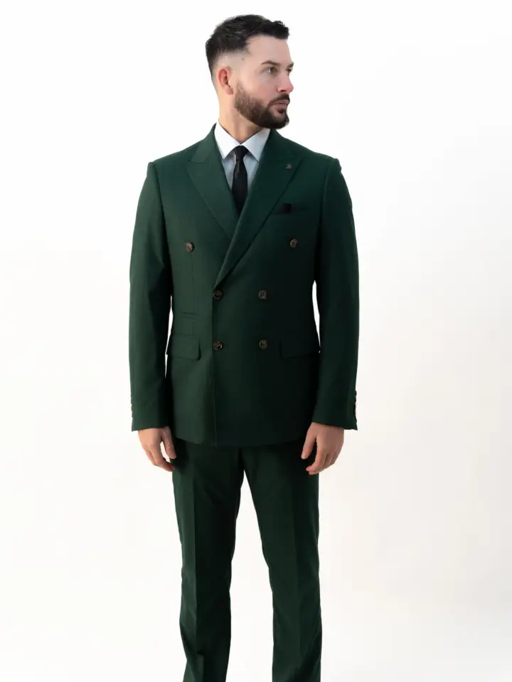 Make a striking impression in this impeccably tailored two-piece suit in a deep, luxurious emerald green. The double-breasted jacket features sharp peak lapels and exquisite button detailing, exuding bold sophistication. Paired with perfectly slim-fit trousers, this ensemble radiates timeless elegance and confident refinement—ideal for distinguished events where standing out with grace is essential.