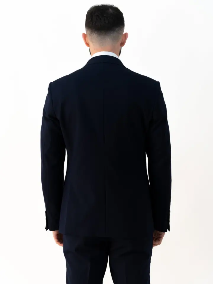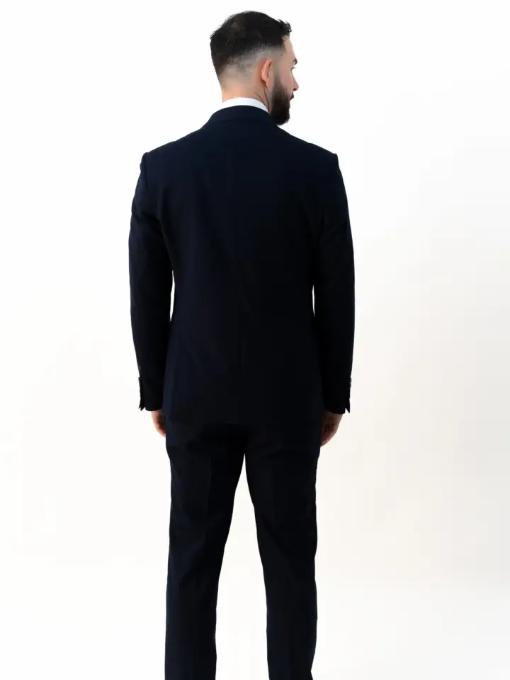 Command attention with this impeccably tailored two-piece suit in a deep, classic navy blue. The double-breasted jacket, adorned with sharp peak lapels and finely detailed buttons, exudes timeless sophistication and authority. Paired with perfectly slim-fit trousers, this ensemble epitomizes refined elegance—perfect for distinguished occasions where power meets style.