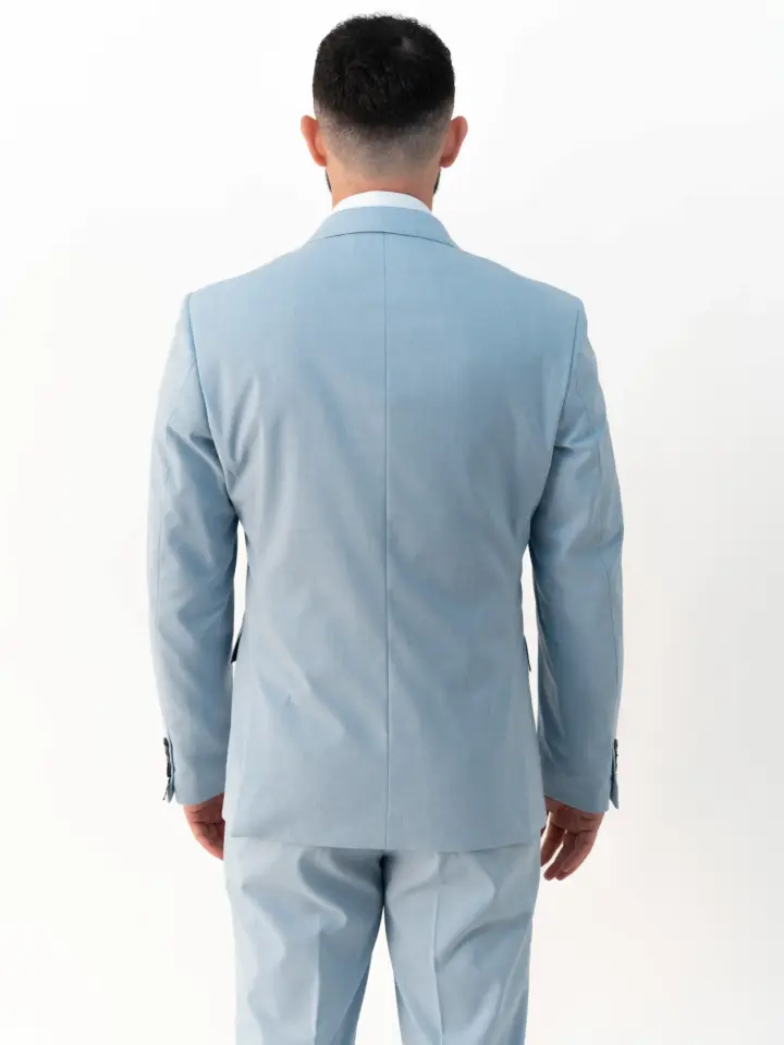 Experience timeless sophistication with this exquisitely tailored two-piece suit in a serene sky-blue hue. The double-breasted jacket, adorned with sharply defined peak lapels and meticulously crafted buttons, exudes commanding elegance. Paired with impeccably slim-fit trousers, this ensemble embodies refined luxury and effortless grace—perfect for distinguished occasions where style and prestige converge.