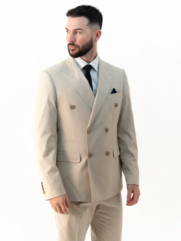 Embrace understated luxury with this impeccably tailored two-piece suit in a sophisticated stone grey hue. The double-breasted jacket, crafted with sharp peak lapels and exquisite button detailing, offers a timeless and polished silhouette. Paired with perfectly slim-fit trousers, this ensemble embodies classic elegance and modern refinement—perfect for occasions where subtlety meets distinction.