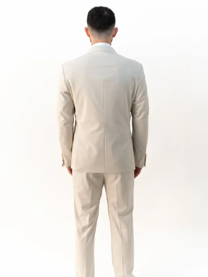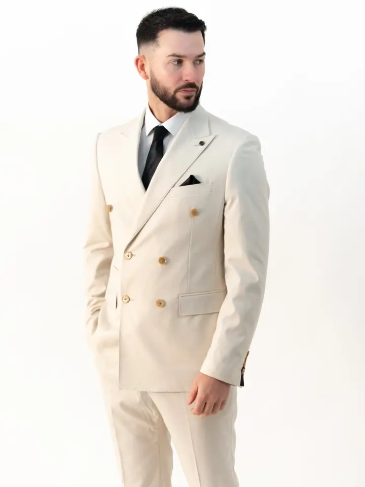 Experience timeless sophistication with this exquisitely tailored two-piece suit in a warm, creamy vanilla shade. The double-breasted jacket, featuring sharply defined peak lapels and finely crafted buttons, radiates understated elegance. Paired with perfectly slim-fit trousers, this ensemble embodies refined luxury and effortless grace—ideal for distinguished occasions where subtlety meets style.