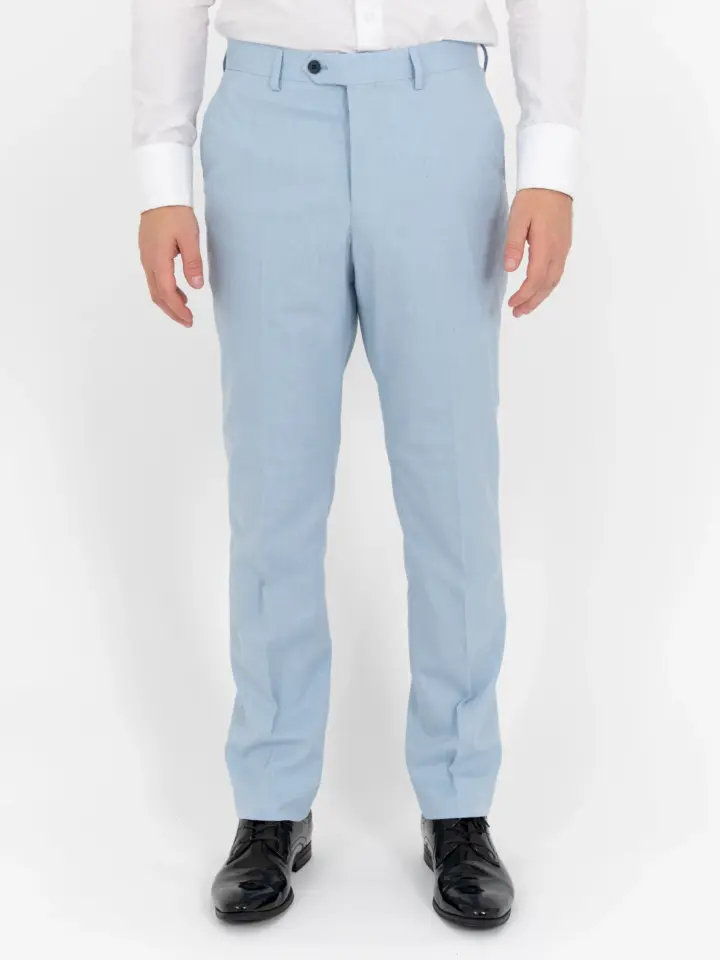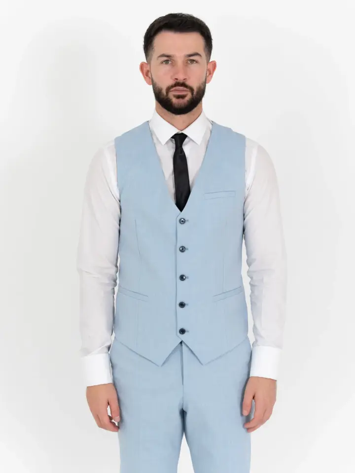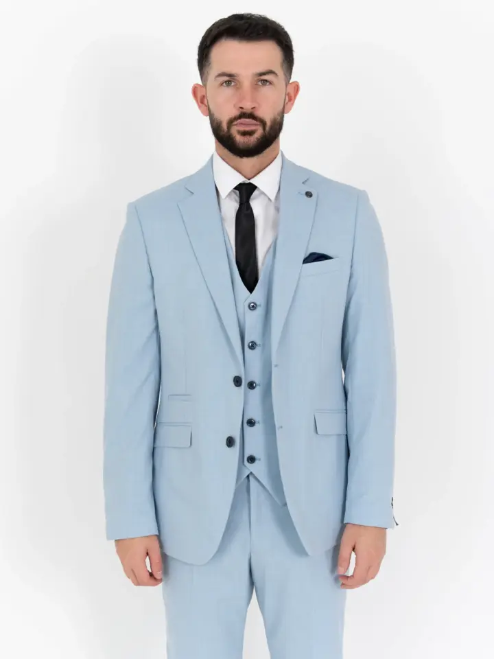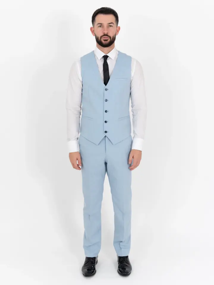 The Jasper suit brings refined elegance with a contemporary edge, featuring a fresh sky blue tone that captures modern sophistication. Expertly tailored for a seamless, modern slim fit, the single-breasted blazer is perfectly matched with a refined waistcoat and sharply cut trousers. The waistcoat’s adjustable back ensures a personalised fit, while the tapered trousers provide a clean, sophisticated silhouette.