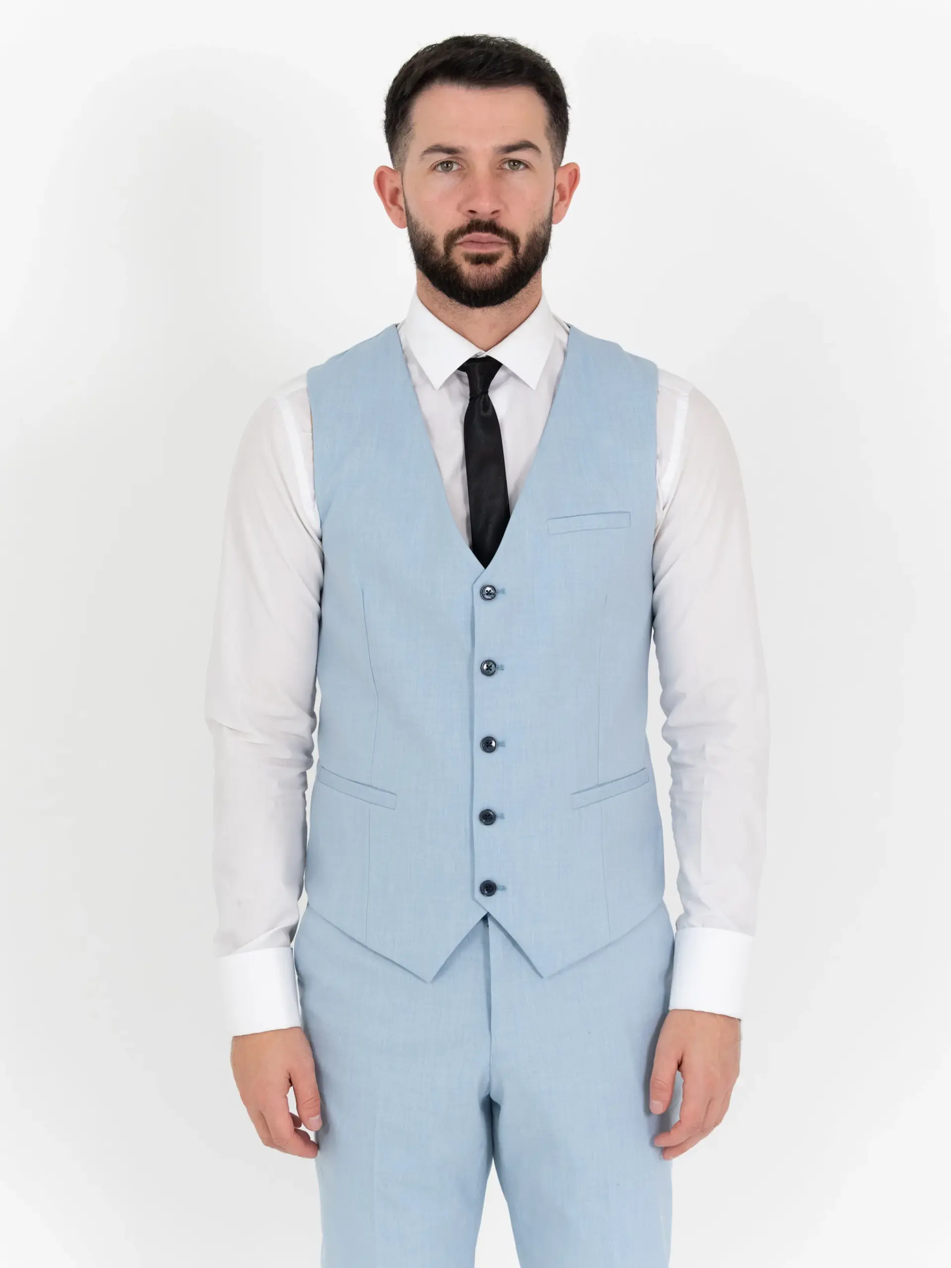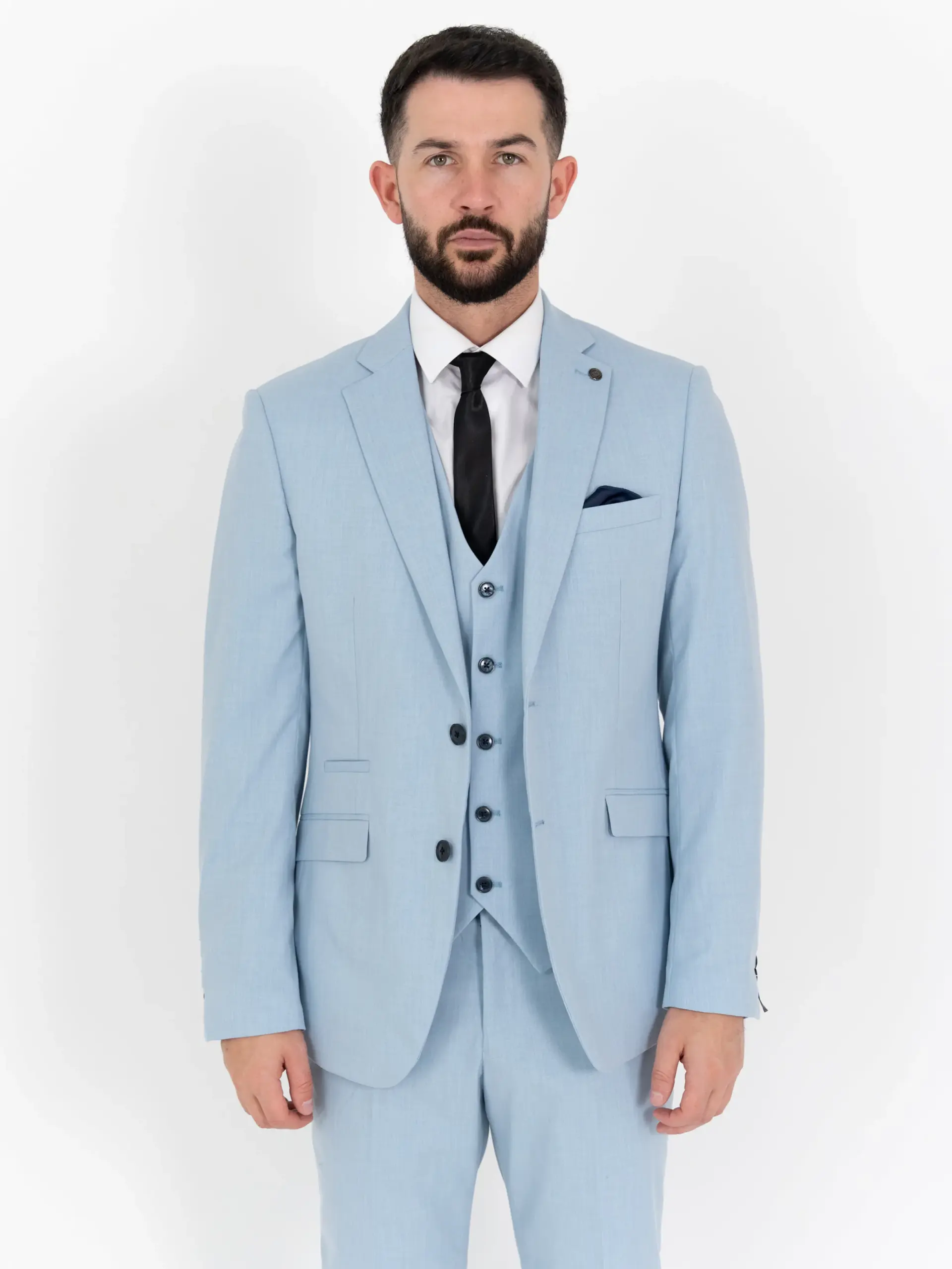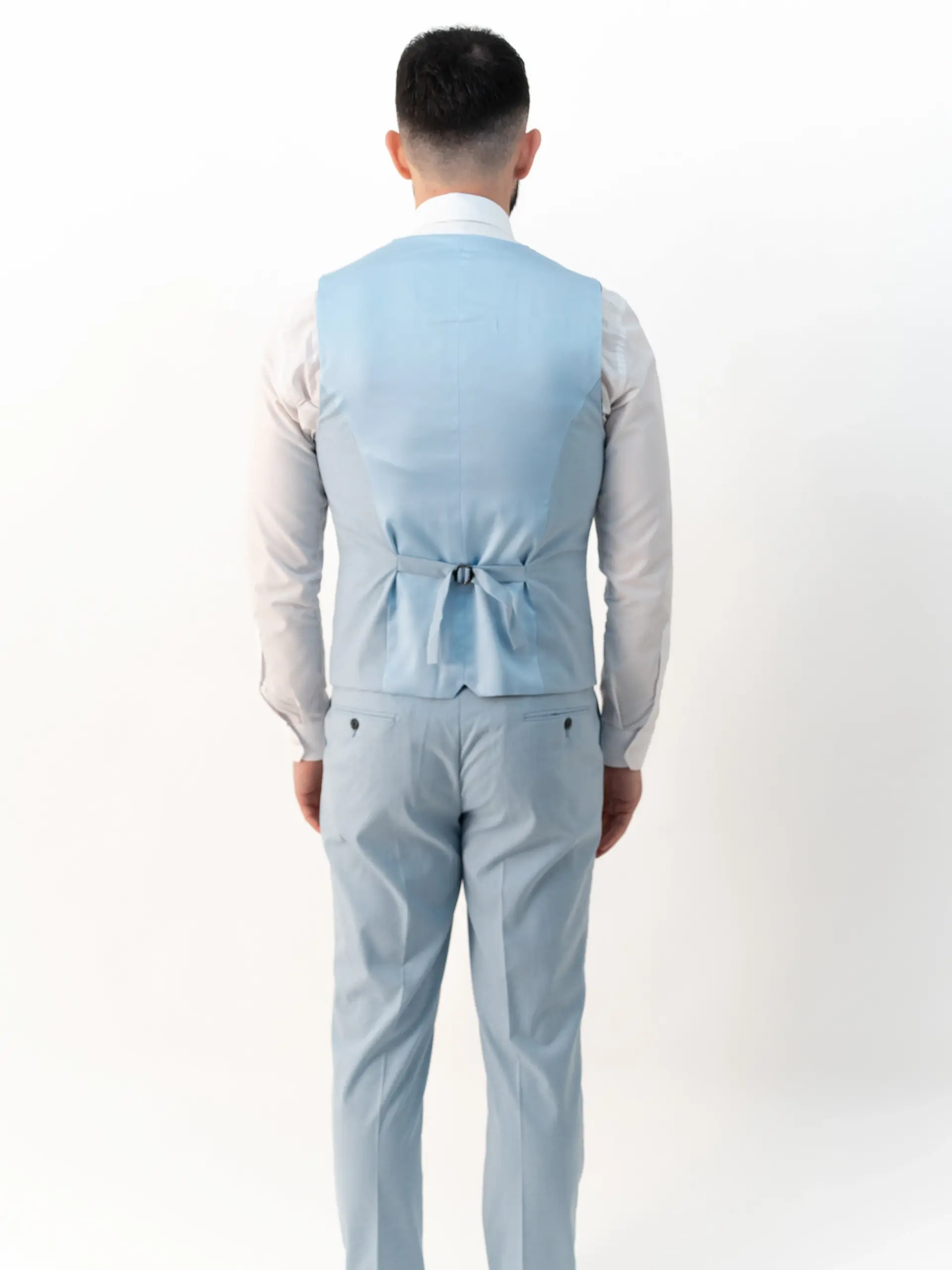 The Jasper suit brings refined elegance with a contemporary edge, featuring a fresh sky blue tone that captures modern sophistication. Expertly tailored for a seamless, modern slim fit, the single-breasted blazer is perfectly matched with a refined waistcoat and sharply cut trousers. The waistcoat’s adjustable back ensures a personalised fit, while the tapered trousers provide a clean, sophisticated silhouette.