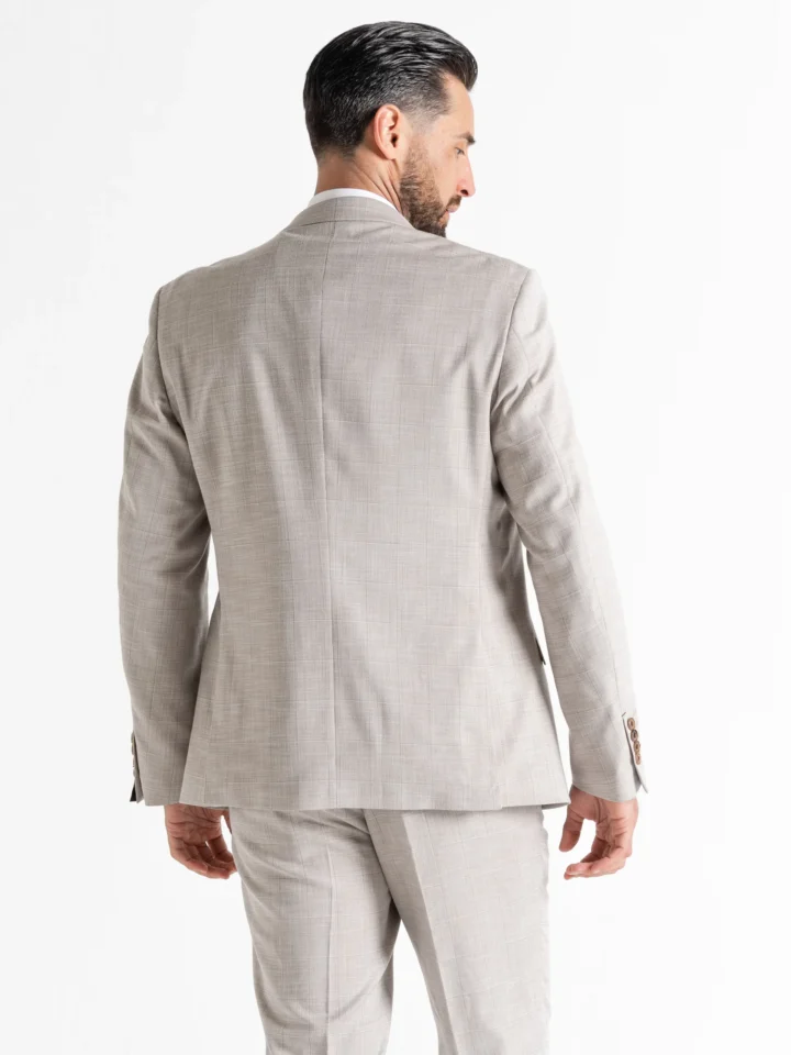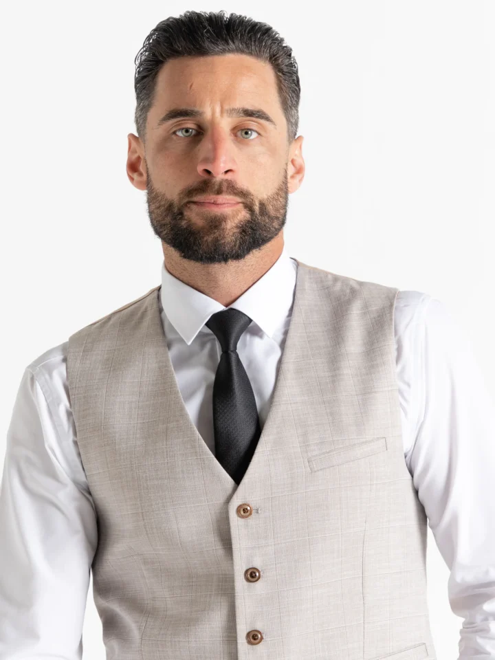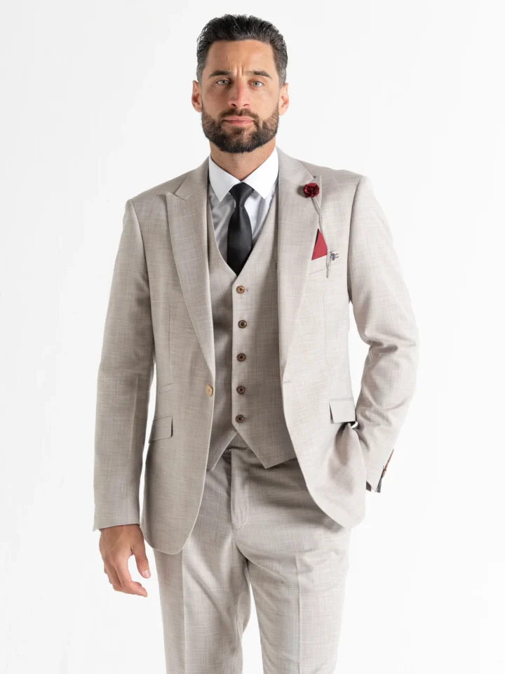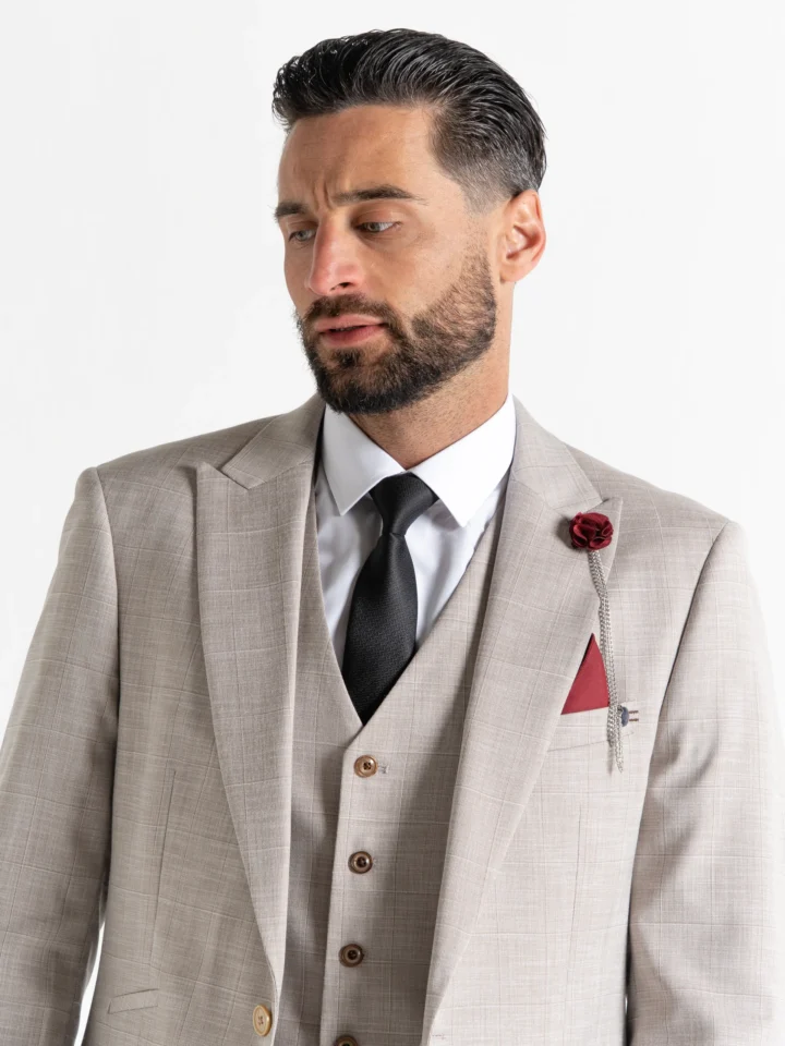 The Kensington suit delivers refined elegance, featuring a cream base complemented by subtle light brown checks. Crafted for a seamless slim fit, the single-breasted blazer is paired with a matching waistcoat and sharply tailored trousers. The waistcoat’s adjustable back ensures comfort, while tapered trousers maintain a sharp profile.