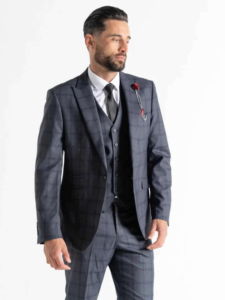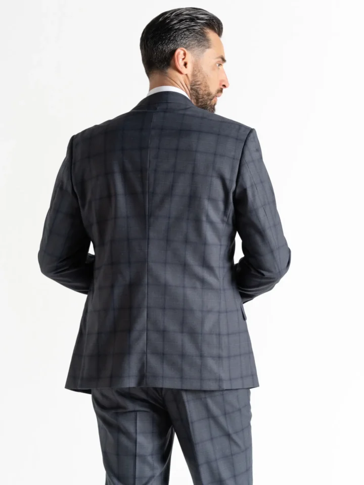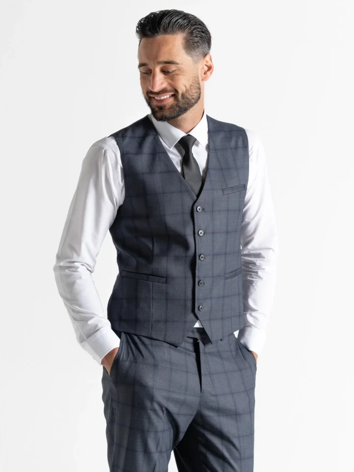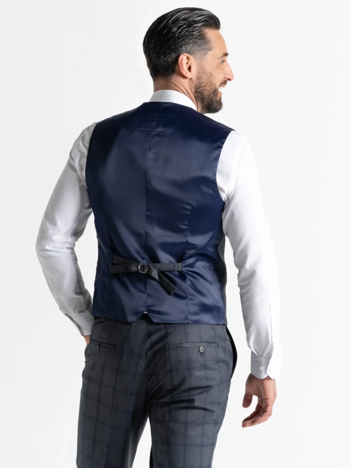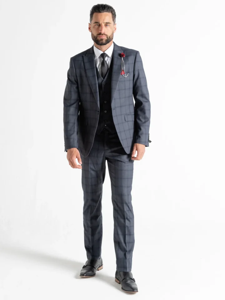 The Kensington suit brings understated power to modern tailoring, featuring a dark grey base accented with refined black checks. Expertly tailored for a seamless, slim fit, the single-breasted blazer is complemented by a matching waistcoat and tapered trousers. The adjustable waistcoat ensures an ideal fit, while the trousers offer a clean, contemporary silhouette.