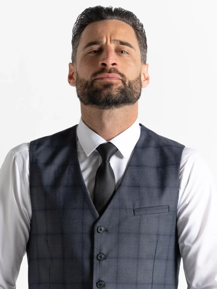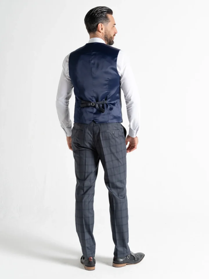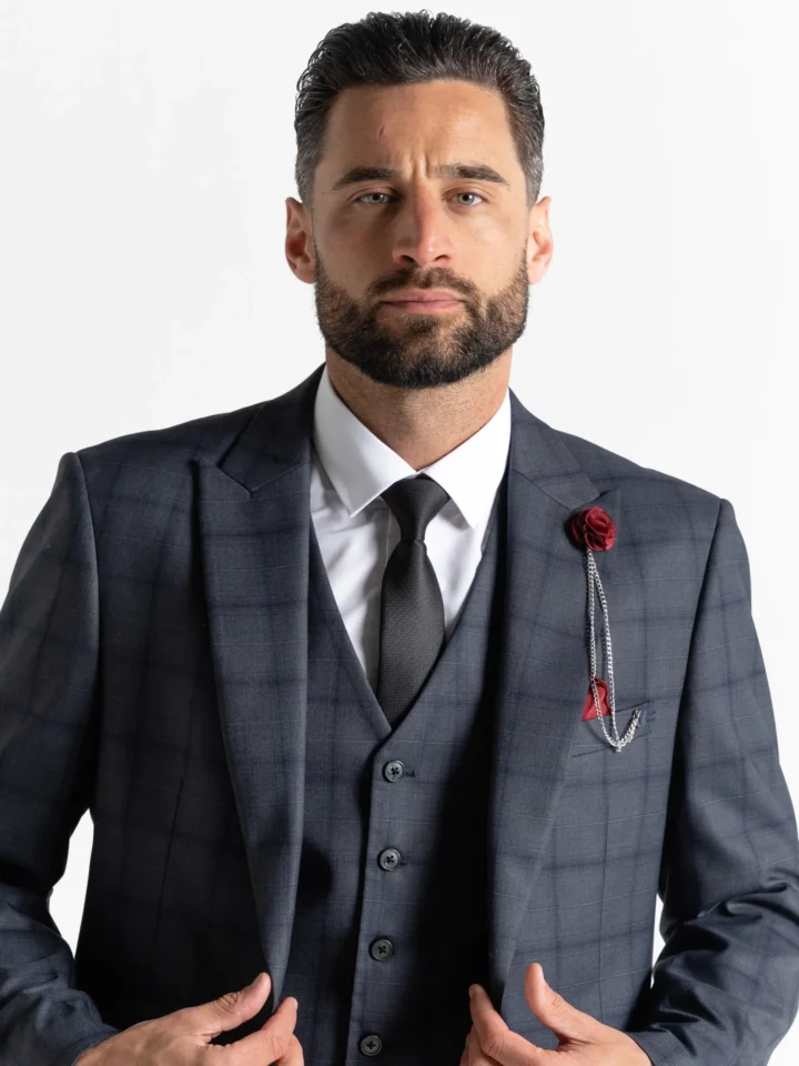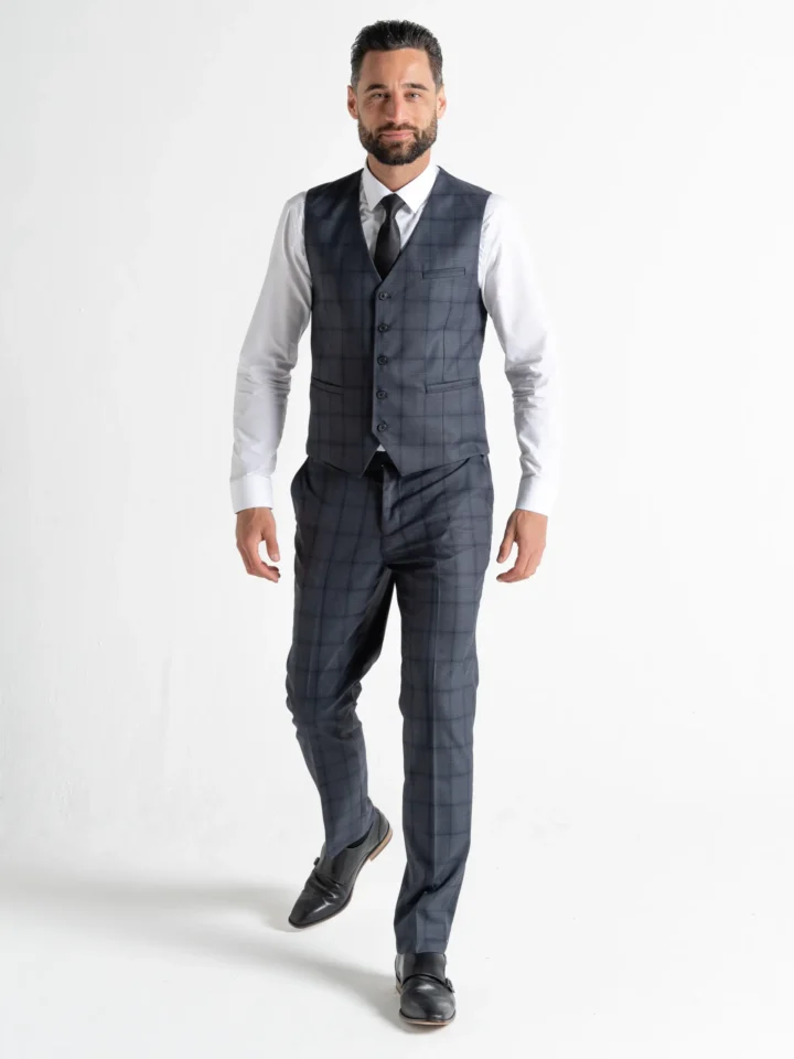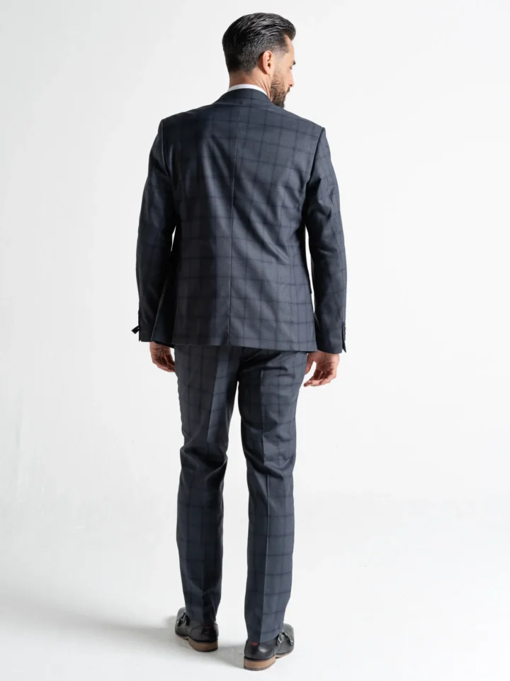 The Kensington suit brings understated power to modern tailoring, featuring a dark grey base accented with refined black checks. Expertly tailored for a seamless, slim fit, the single-breasted blazer is complemented by a matching waistcoat and tapered trousers. The adjustable waistcoat ensures an ideal fit, while the trousers offer a clean, contemporary silhouette.