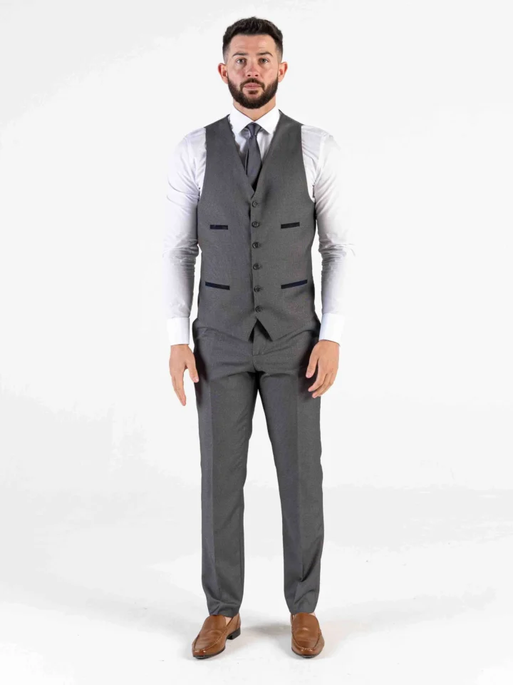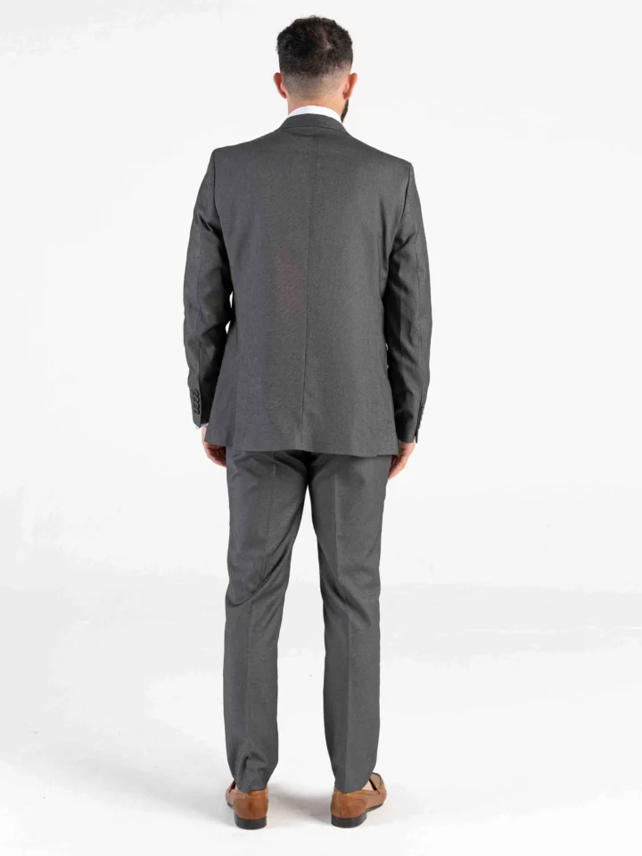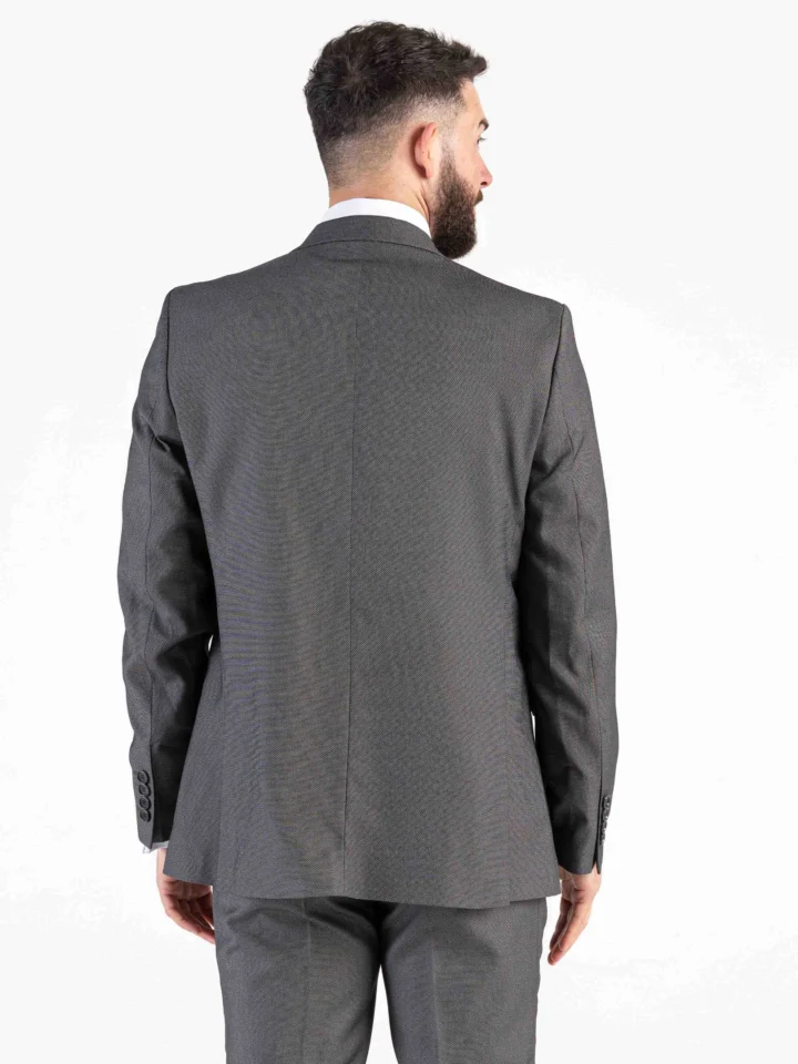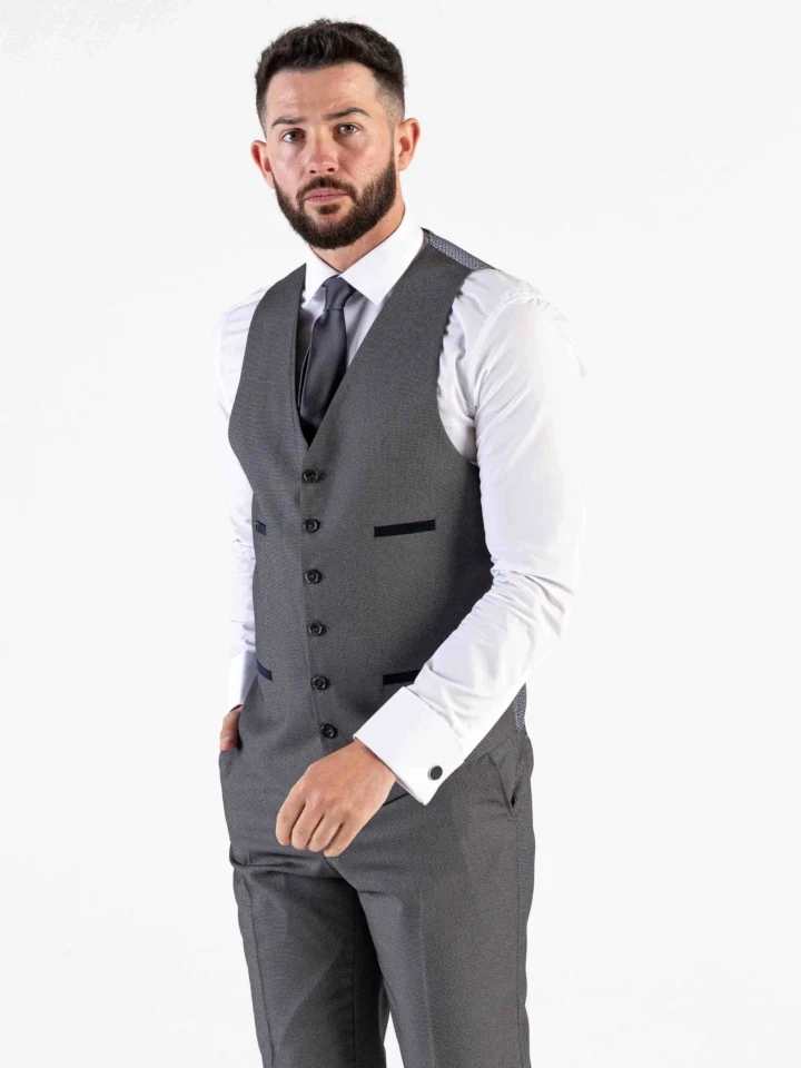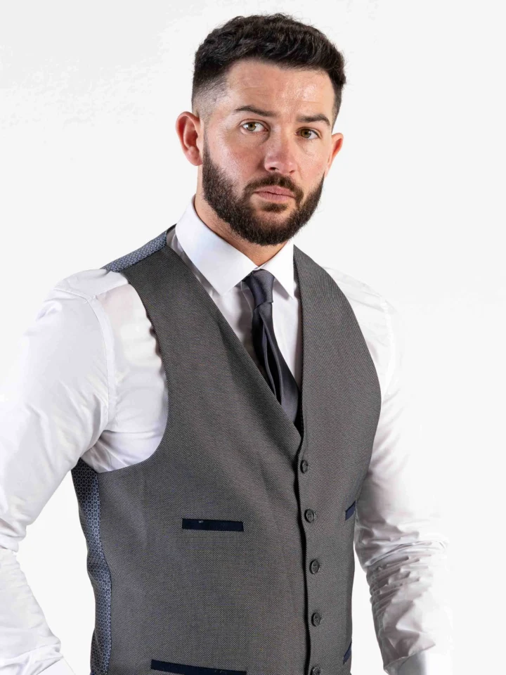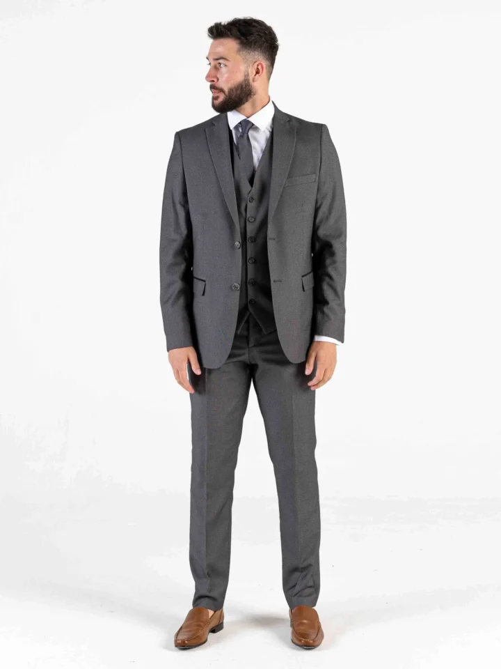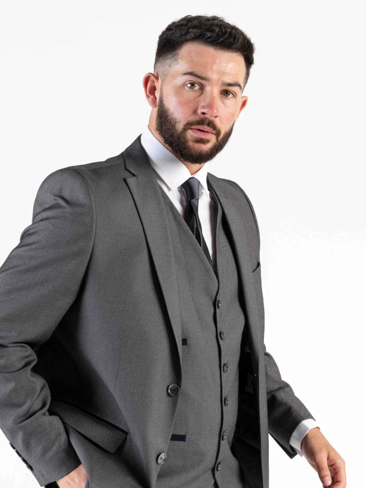 This tailored fit Oliver suit is a wardrobe staple for the ideal formal look. The three piece comes in a versatile textured grey and a perfect classic tailored fit. Finished with a matching four welted waistcoat and grey tailored fit trousers. Pair with a silk tie for a refined office look.