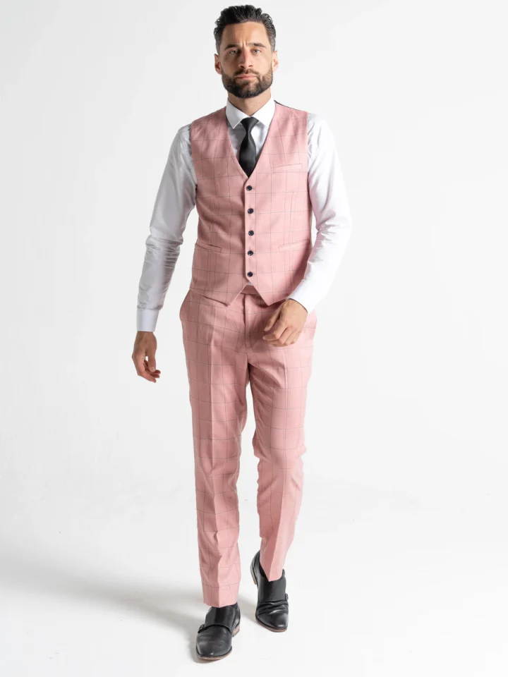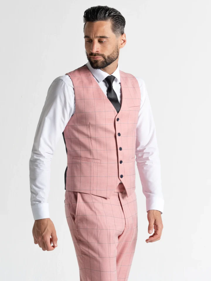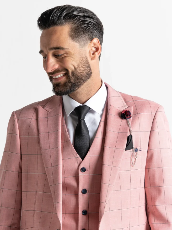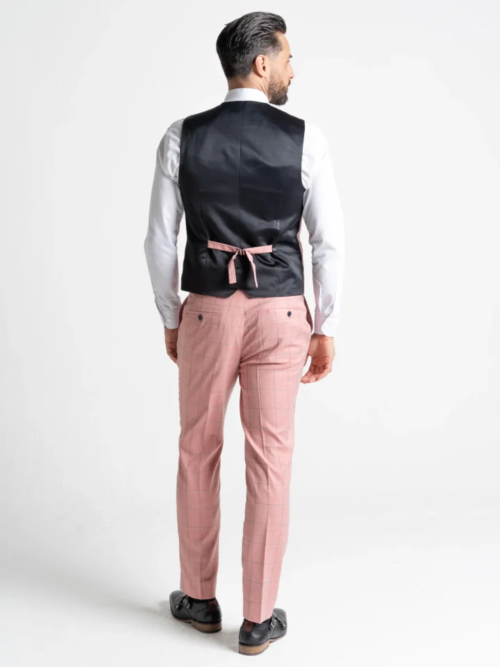 The Oxford suit makes a confident style statement, featuring a refined pink base with bold black checks. Expertly tailored for a seamless, modern slim fit, the single-breasted blazer pairs effortlessly with a fitted waistcoat and tapered trousers. The adjustable waistcoat allows a perfect fit, while the trousers maintain a sharp finish.