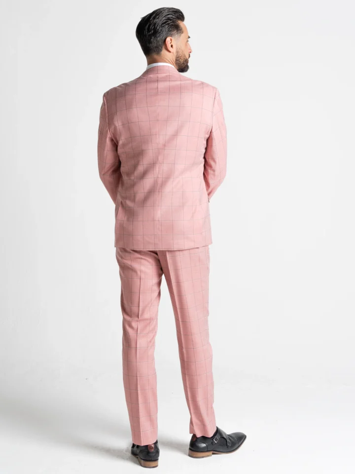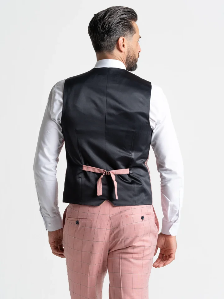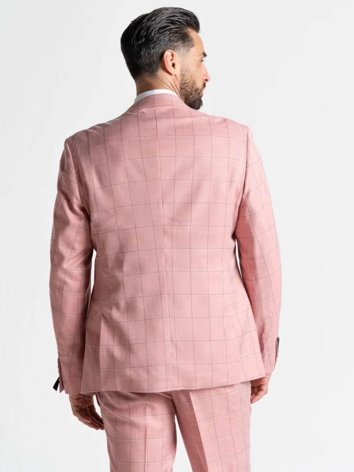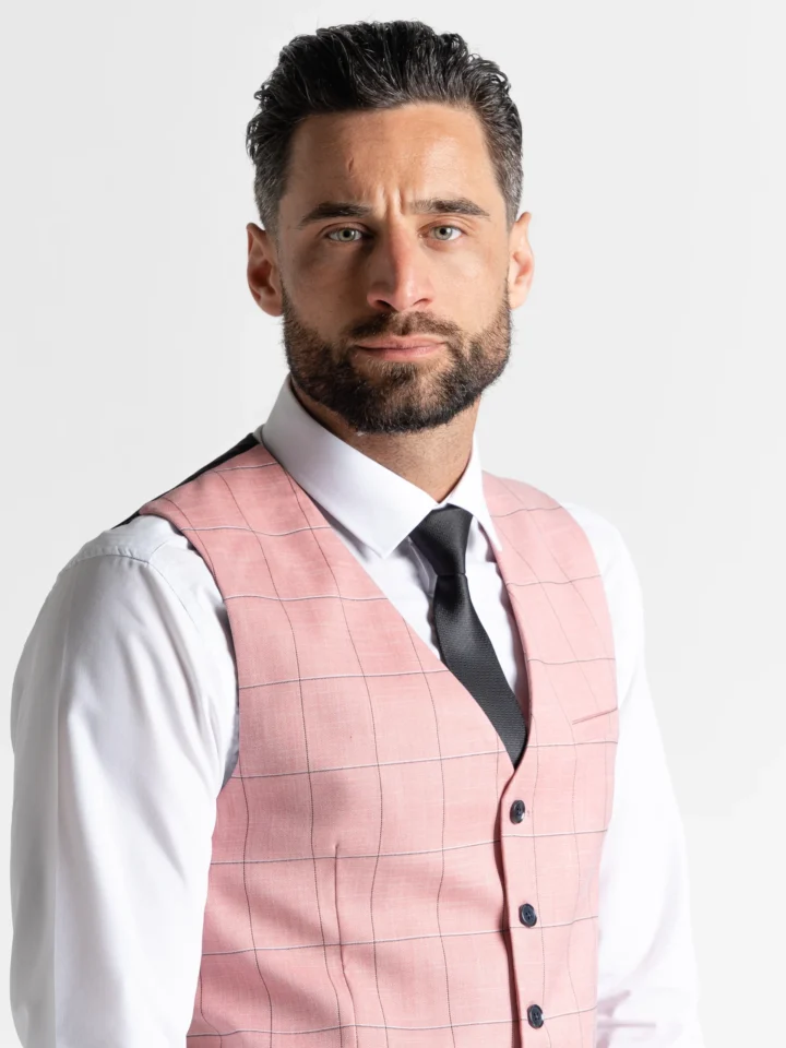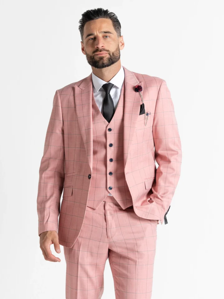 The Oxford suit makes a confident style statement, featuring a refined pink base with bold black checks. Expertly tailored for a seamless, modern slim fit, the single-breasted blazer pairs effortlessly with a fitted waistcoat and tapered trousers. The adjustable waistcoat allows a perfect fit, while the trousers maintain a sharp finish.