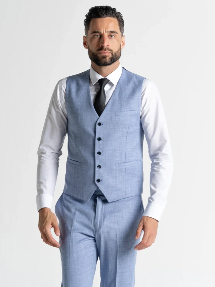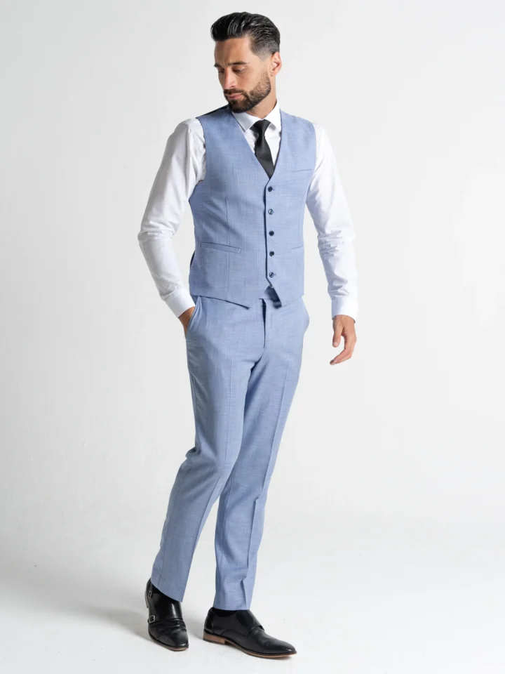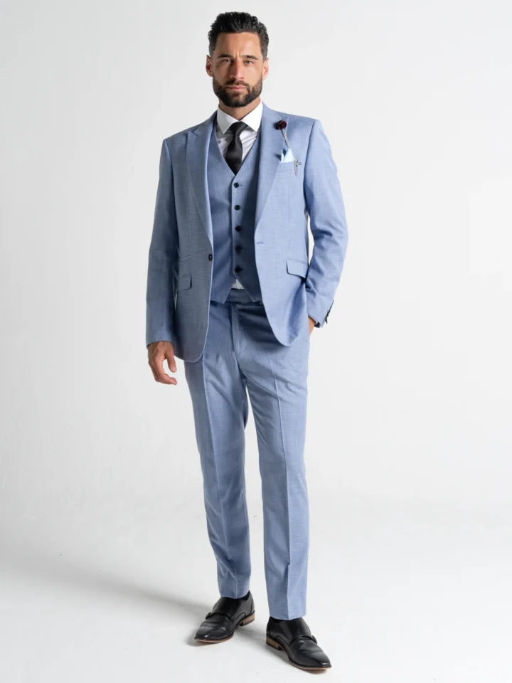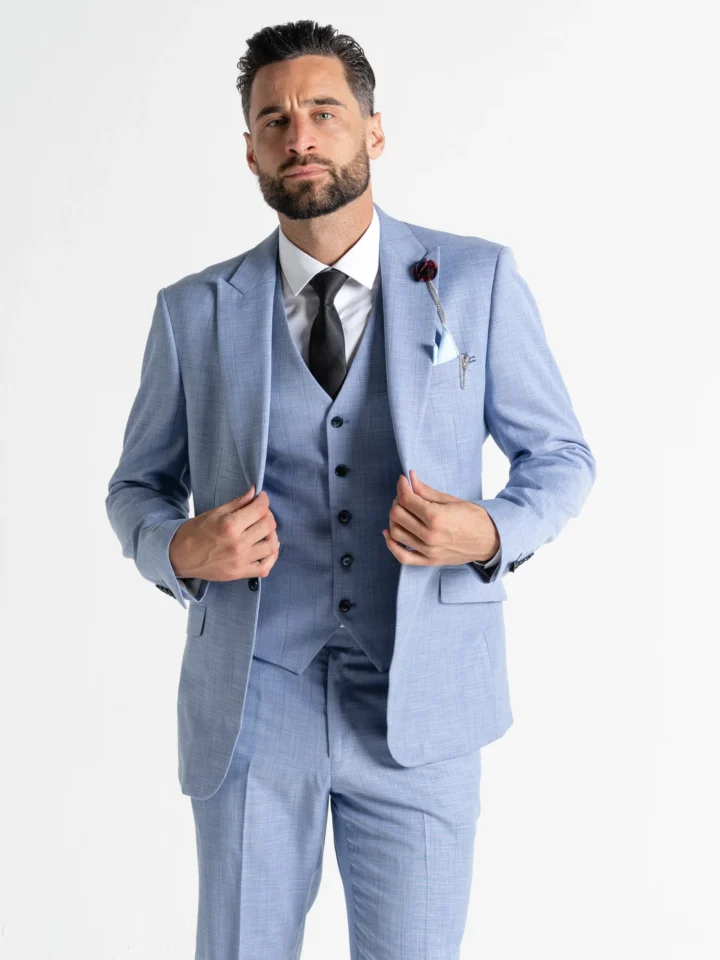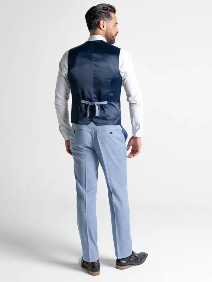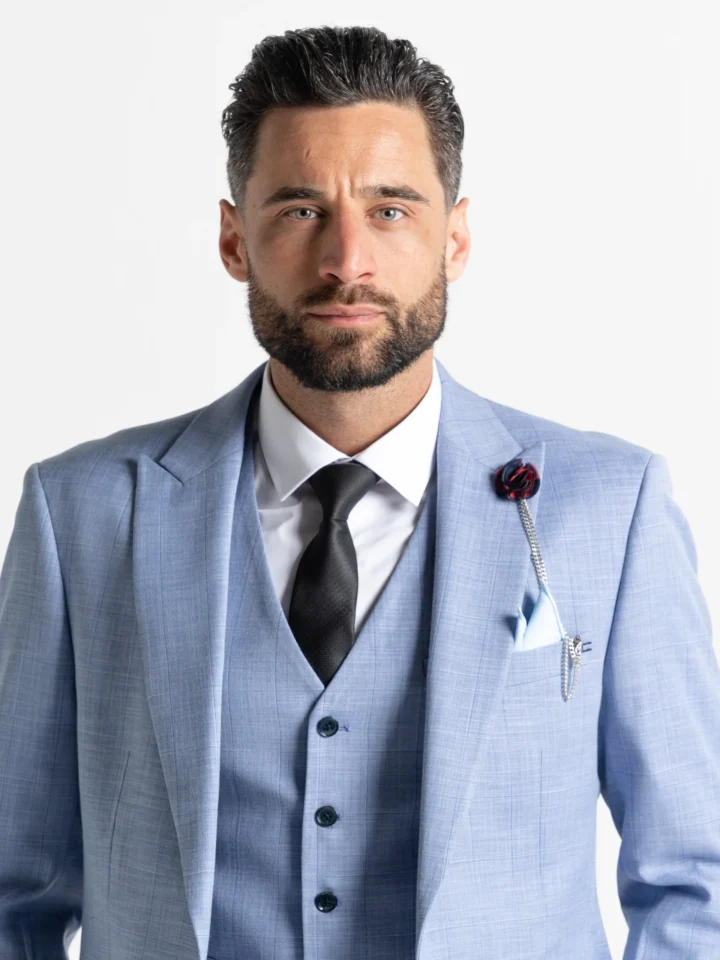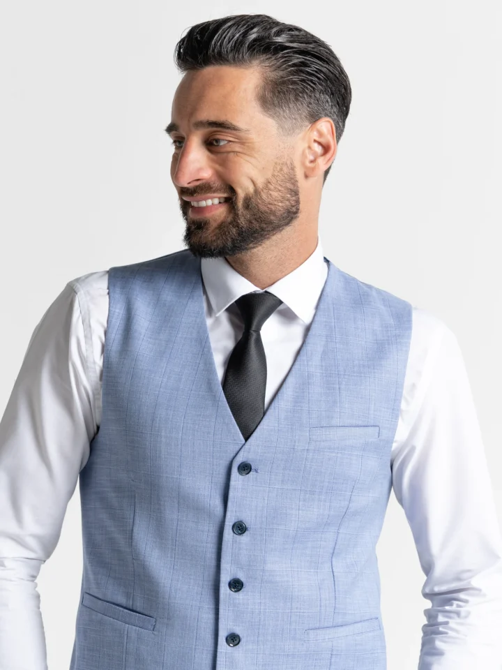 The Oxford suit offers crisp, modern refinement, featuring a fresh sky blue tone subtly detailed with blue checks. Expertly tailored for a seamless, slim fit, the single-breasted blazer pairs effortlessly with a refined waistcoat and sharply cut trousers. The adjustable waistcoat provides a personalised fit, while tapered trousers deliver a clean silhouette.
