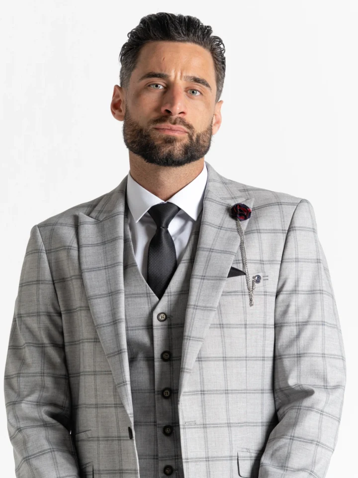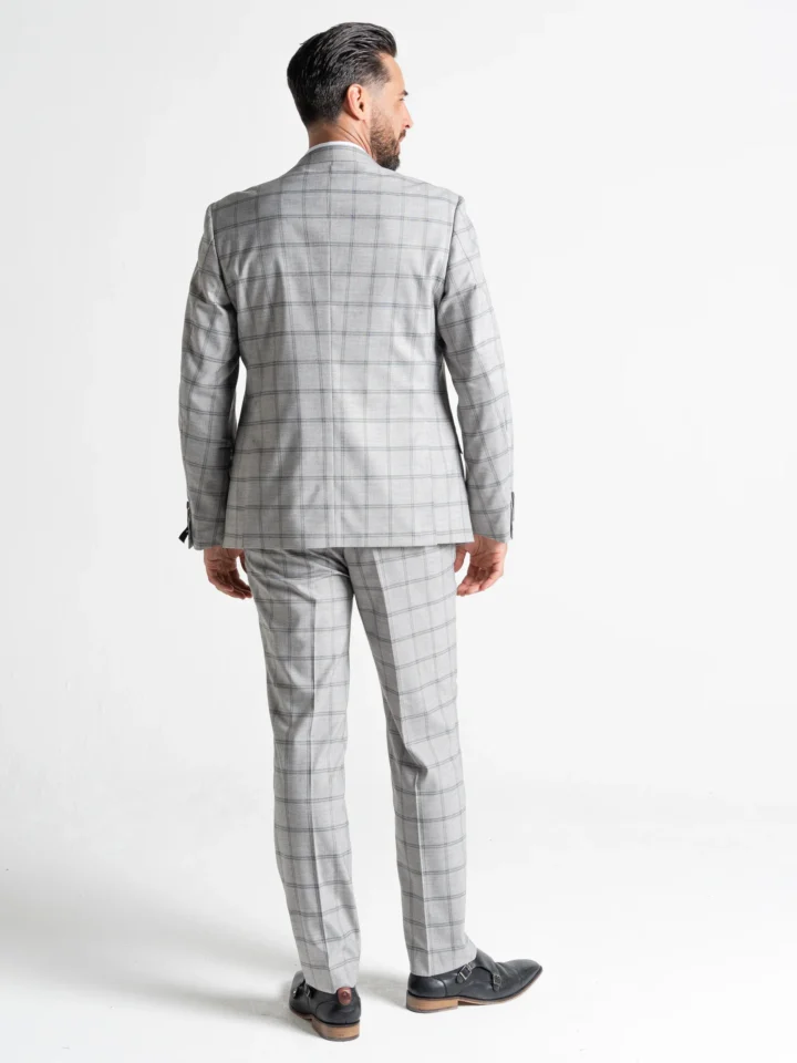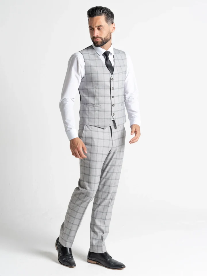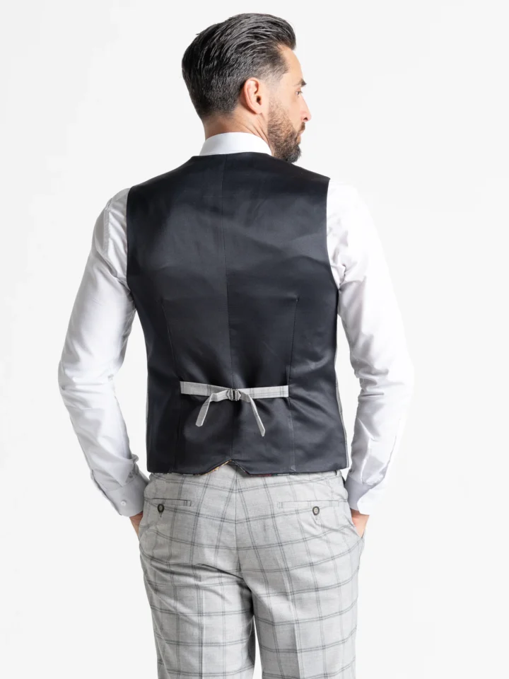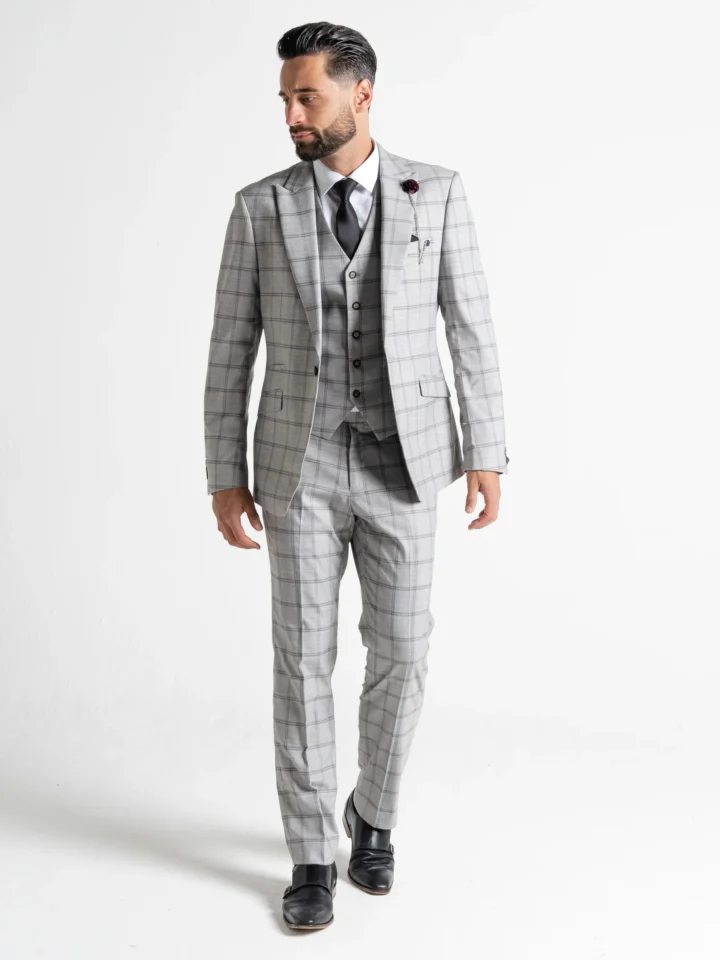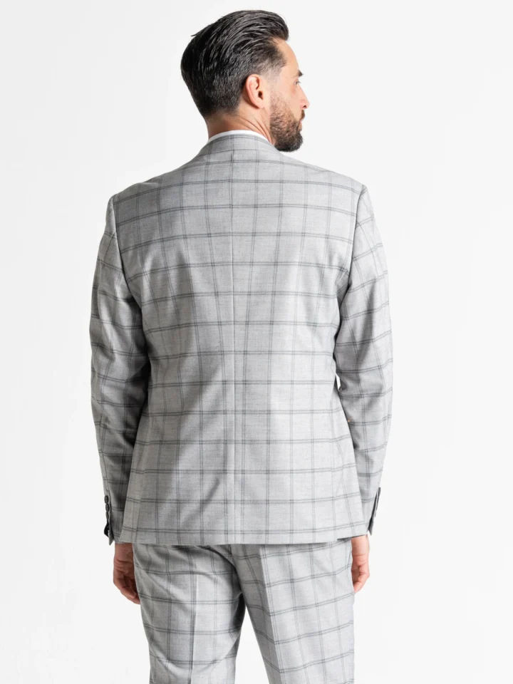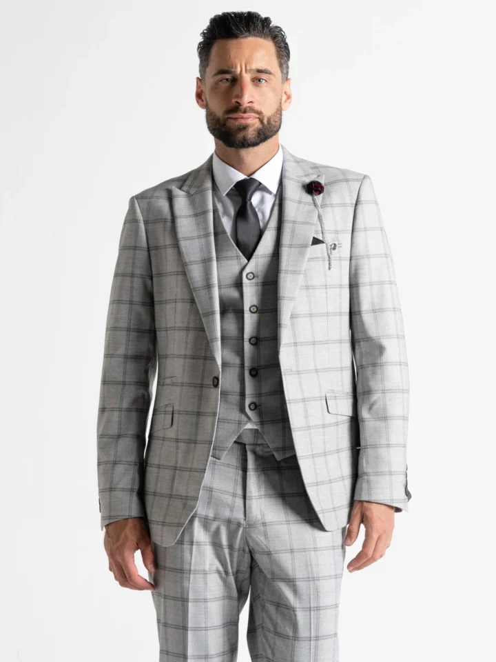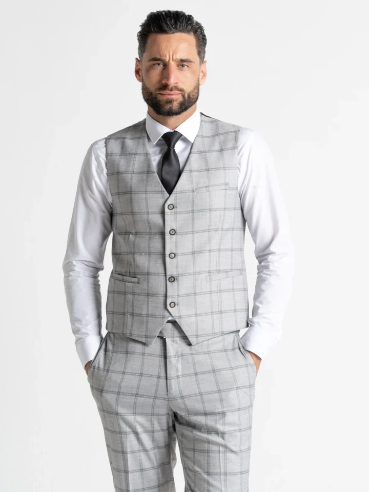 The Oxford suit brings understated elegance with a modern finish, featuring a soft grey base adorned with refined black checks. Expertly tailored for a seamless, slim fit, the single-breasted blazer pairs flawlessly with a matching waistcoat and tailored trousers. The waistcoat’s adjustable back allows a customised fit, while tapered trousers complete the sleek silhouette.