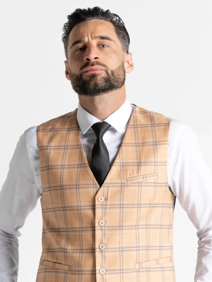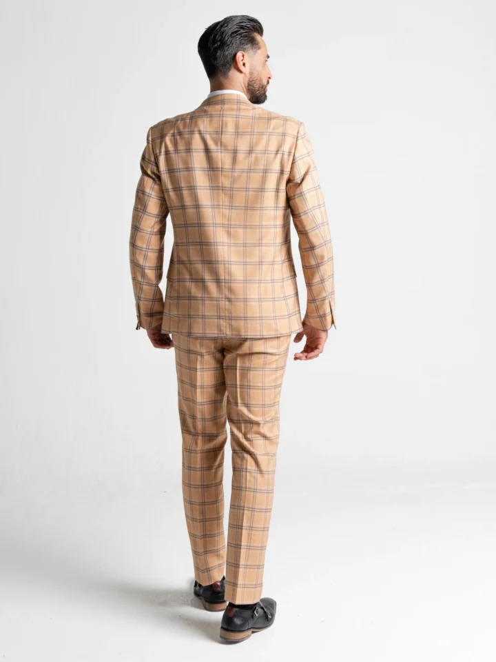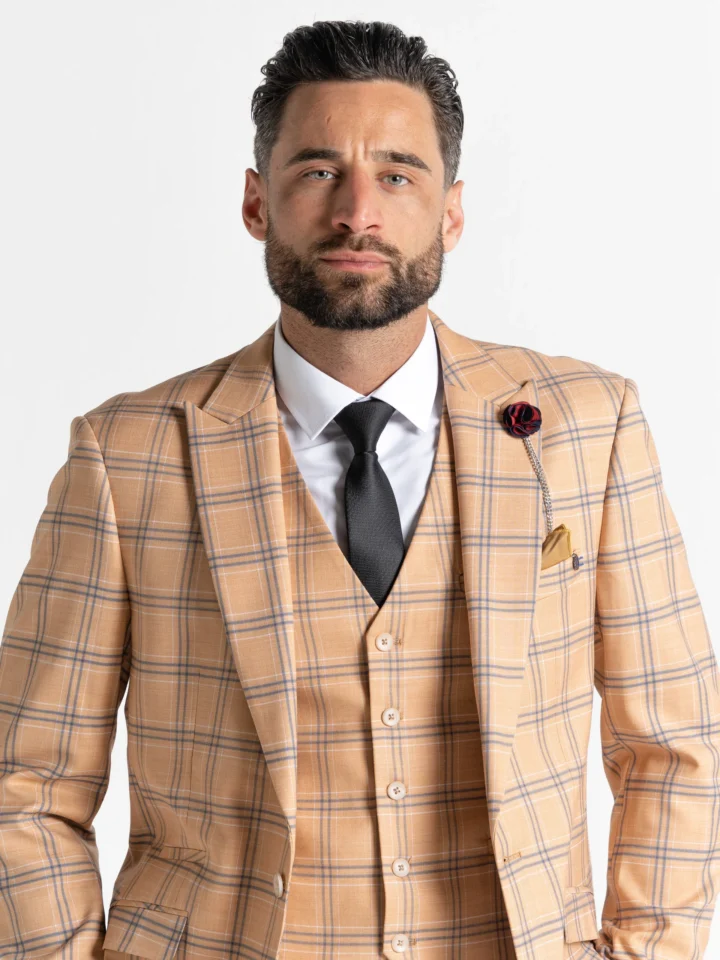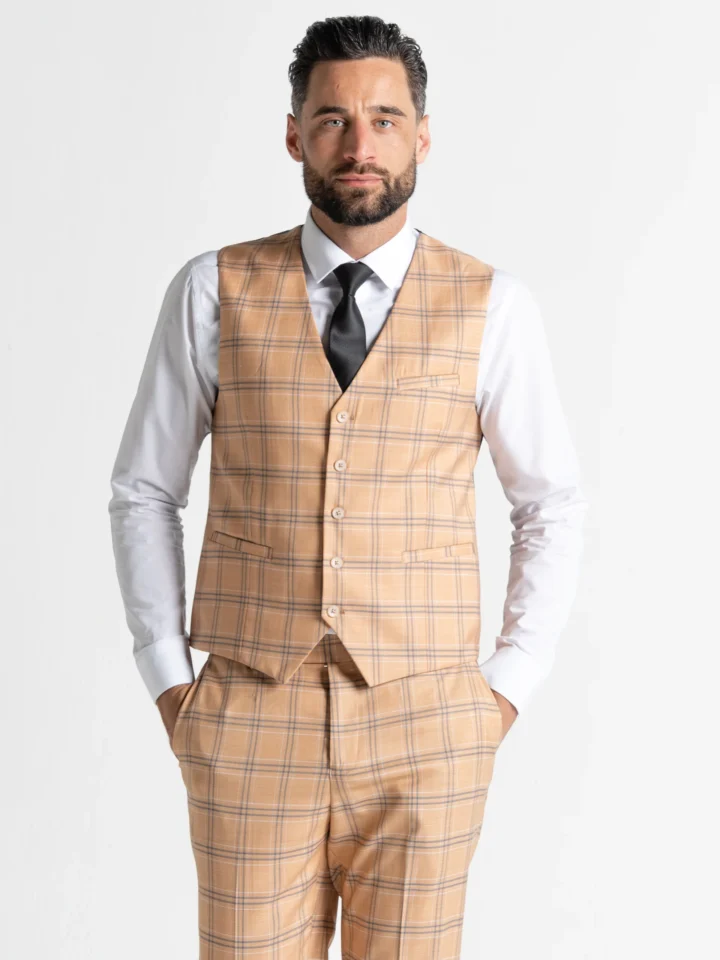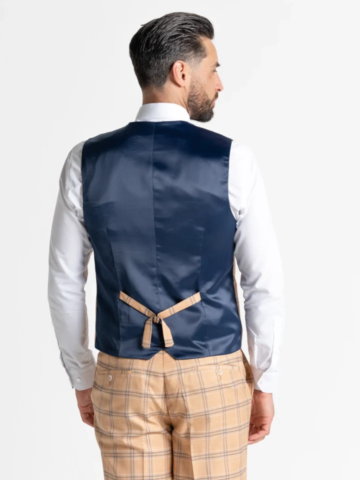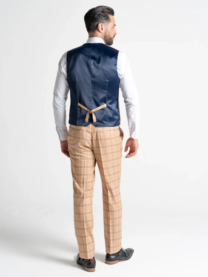The Oxford suit offers timeless style with a bold twist, featuring a soft orange base complemented by refined navy blue checks. Expertly tailored for a seamless, modern slim fit, the single-breasted blazer is perfectly matched with a fitted waistcoat and sharply cut trousers. The adjustable waistcoat provides a personalised fit, while the tapered trousers deliver a sleek finish.