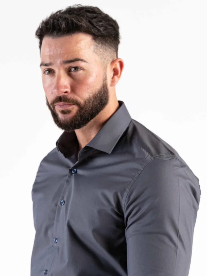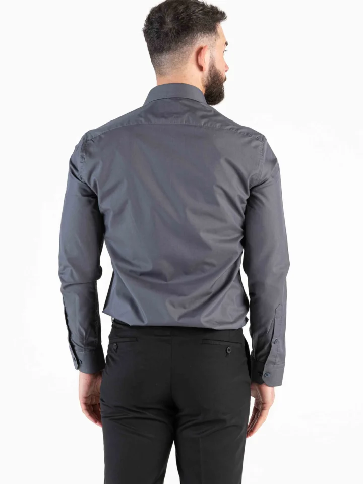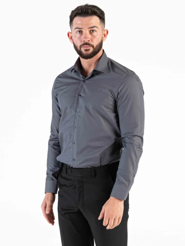 Step away from the average white shirt and add a subtle edge with the classic dark grey. This staple is cut to a classic fit featuring long sleeves and a spread collar.